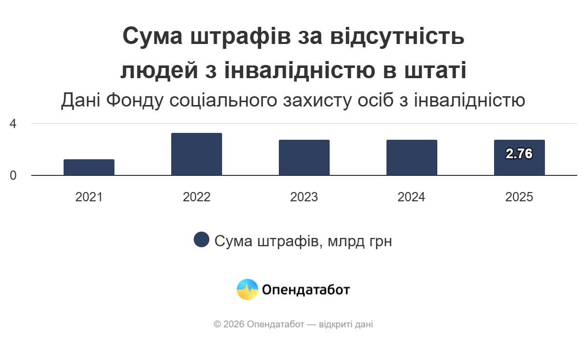 У 2025 році майже дев’ять тисяч українських роботодавців отримали штрафи через невиконання вимог щодо працевлаштування людей з інвалідністю. Загальна сума санкцій сягнула 2,76 мільярда гривень.