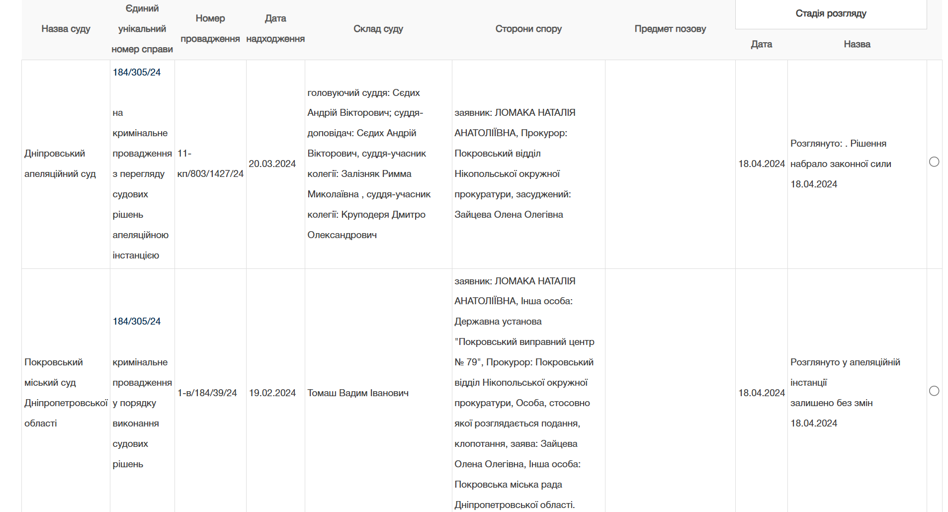 Суд першої інстанції, Покровський міський суд Дніпропетровської області, відмовився звільнити Зайцеву достроково, мотивуючи тим, що засуджена має «посередні (не негативні, не конкретно позитивні) чинники», які б підтверджували, що засуджена стала на шлях виправлення.