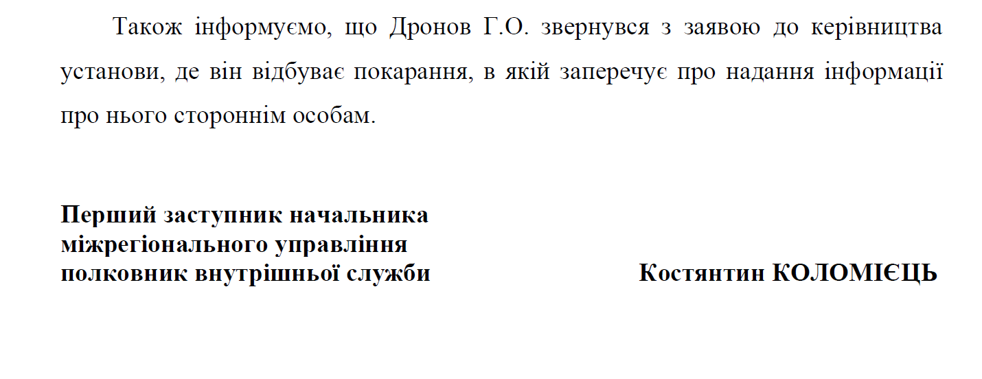 «Також інформуємо, що Дронов Г.О. звернувся з заявою до керівництва установи, де він відбуває покарання, в якій заперечує про надання інформації про нього стороннім особам», — резюмували в управлінні у відповідь на запит 10 жовтня 2025.
