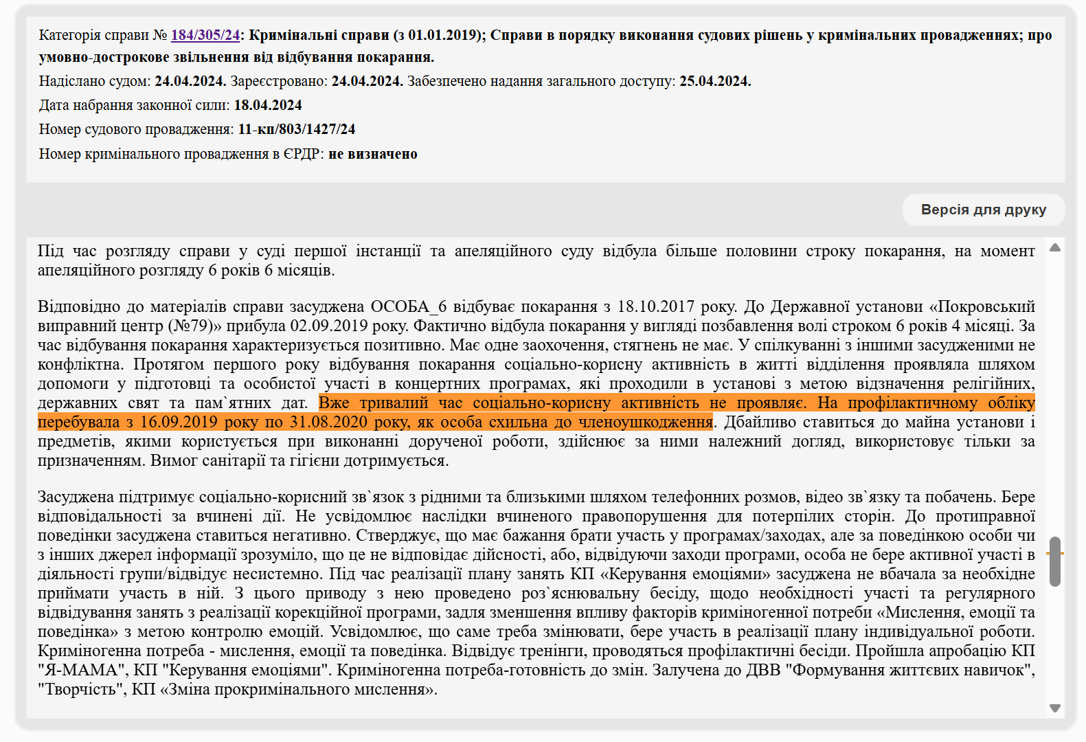 «Вже тривалий час соціально-корисну активність не проявляє. На профілактичному обліку перебувала з 16.09.2019 року по 31.08.2020 року, як особа схильна до членоушкодження», — вказано у документі без деталей.