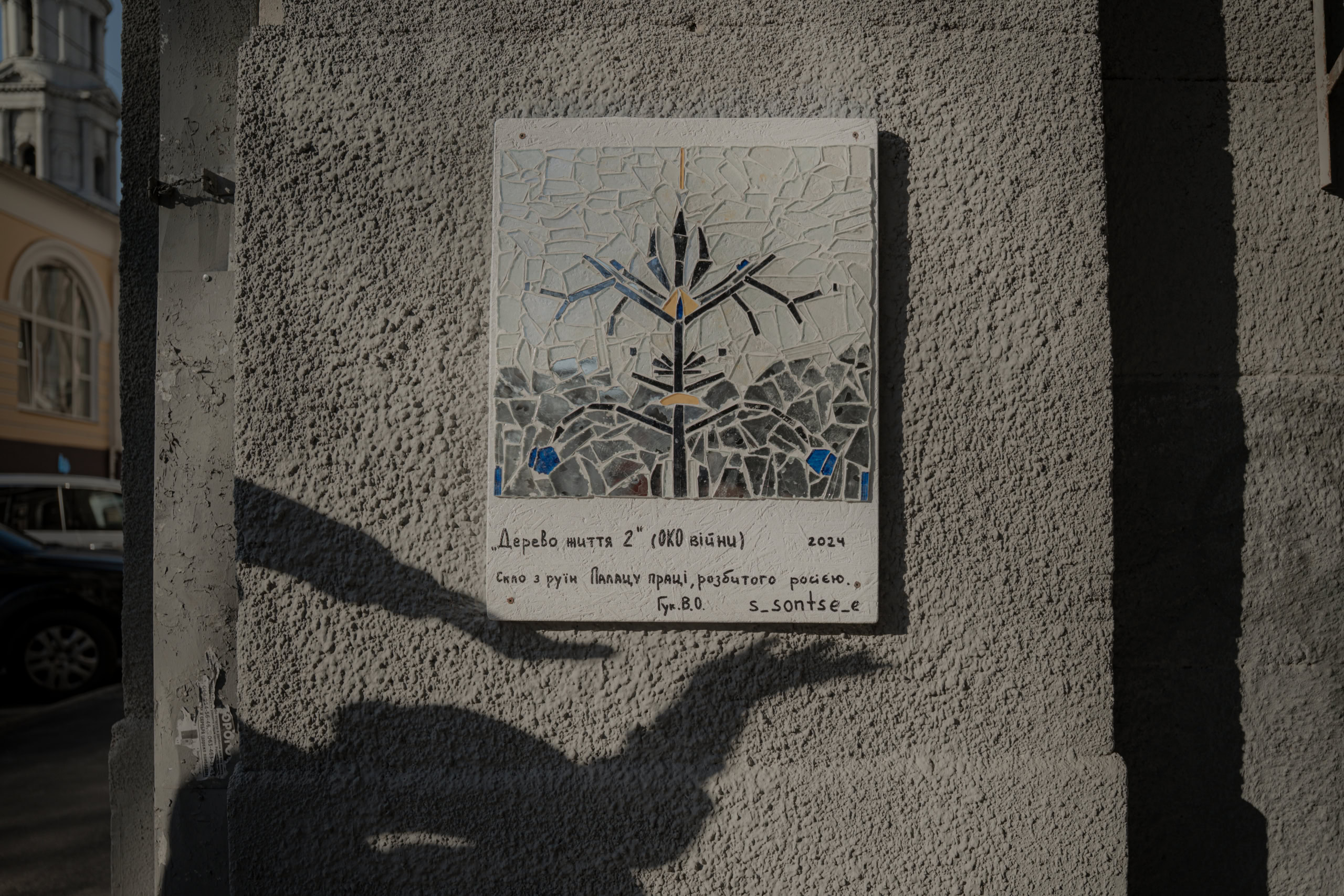 Так, біля «Пакуфуди» — зі скла з Держпрому. Є мозаїка із зображенням Палацу праці. Біля Палацу праці — аж три роботи, дві з яких із серії «Дерево життя». Є мозаїка за будівлею Харківської ОДА. Ще одна — біля кав’ярні «Мейкерс» в Ізюмі. Там скло було зібране по всьому місту. Є ще мозаїка в «Мейкерсі» в Харкові, де після прильоту вибило вікна.