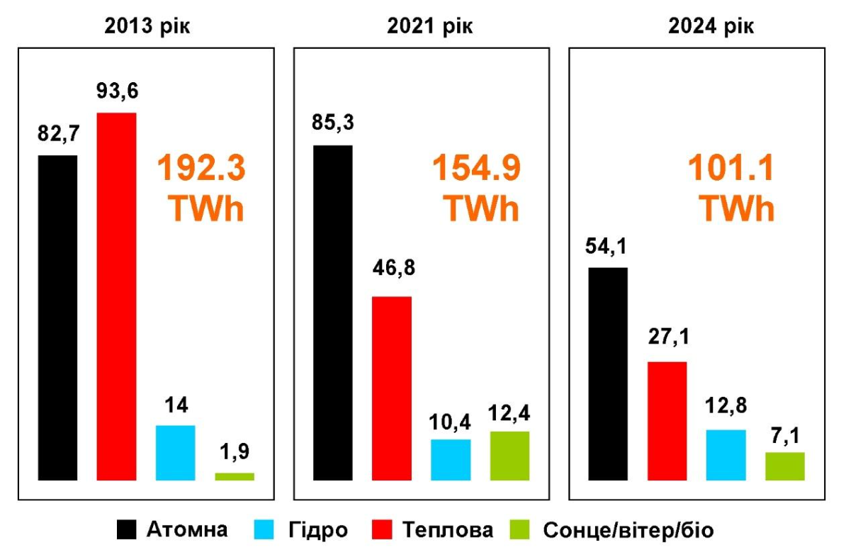 Наприклад, втрата Запорізької АЕС та вугільних регіонів Донбасу призвела до суттєвого зменшення виробництва електричної енергії тепловими та атомними електростанціями, а співставного збільшення інших видів генерації не відбулося.
