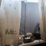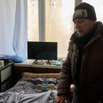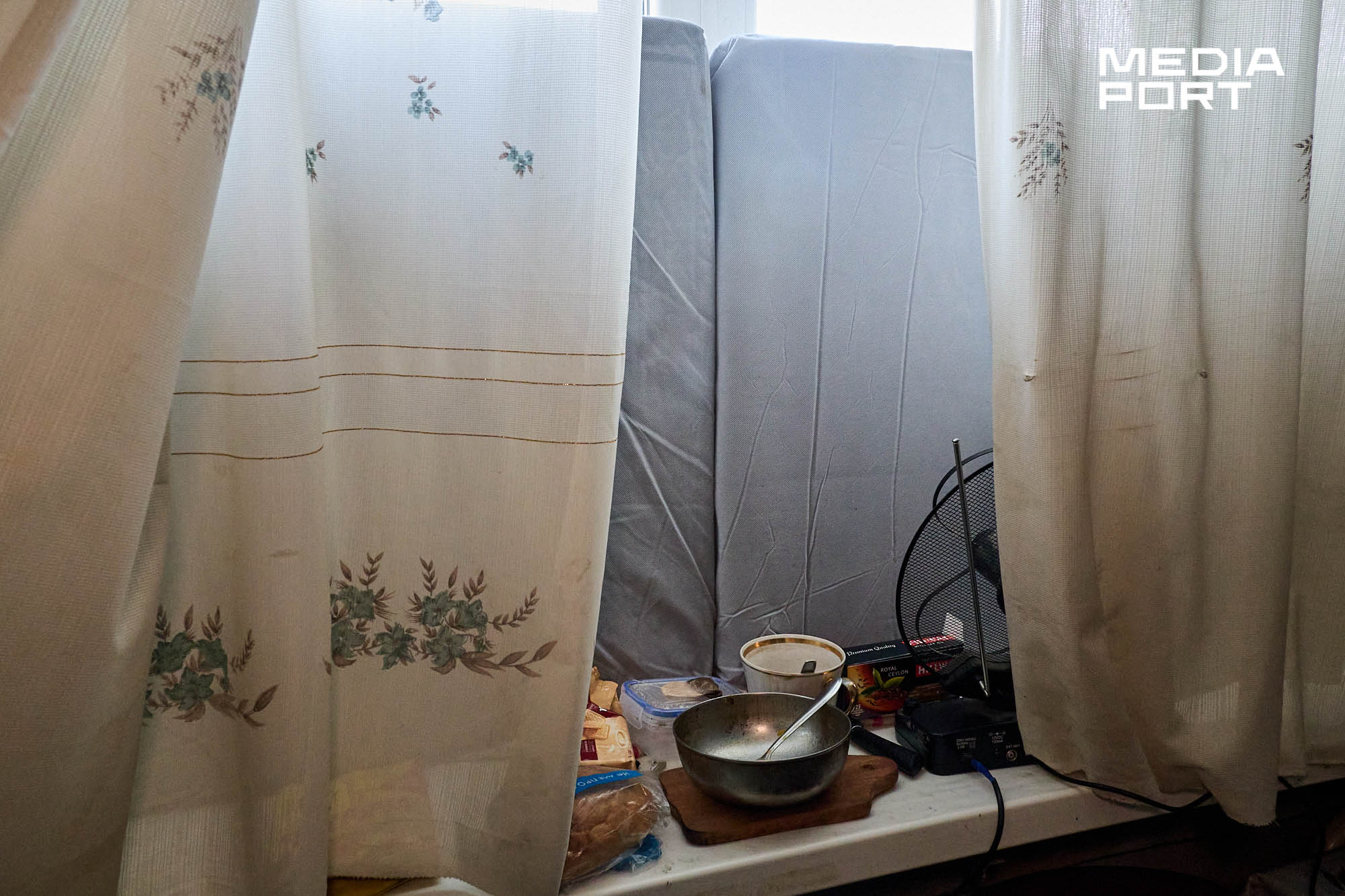 На дев’ятому поверсі тепліше. Ігор Бондаренко з села Гусинка Куп’янського району живе у гуртожитку майже рік. Вікна заклеїв підручними матеріалами — навіть шматками шпалер.