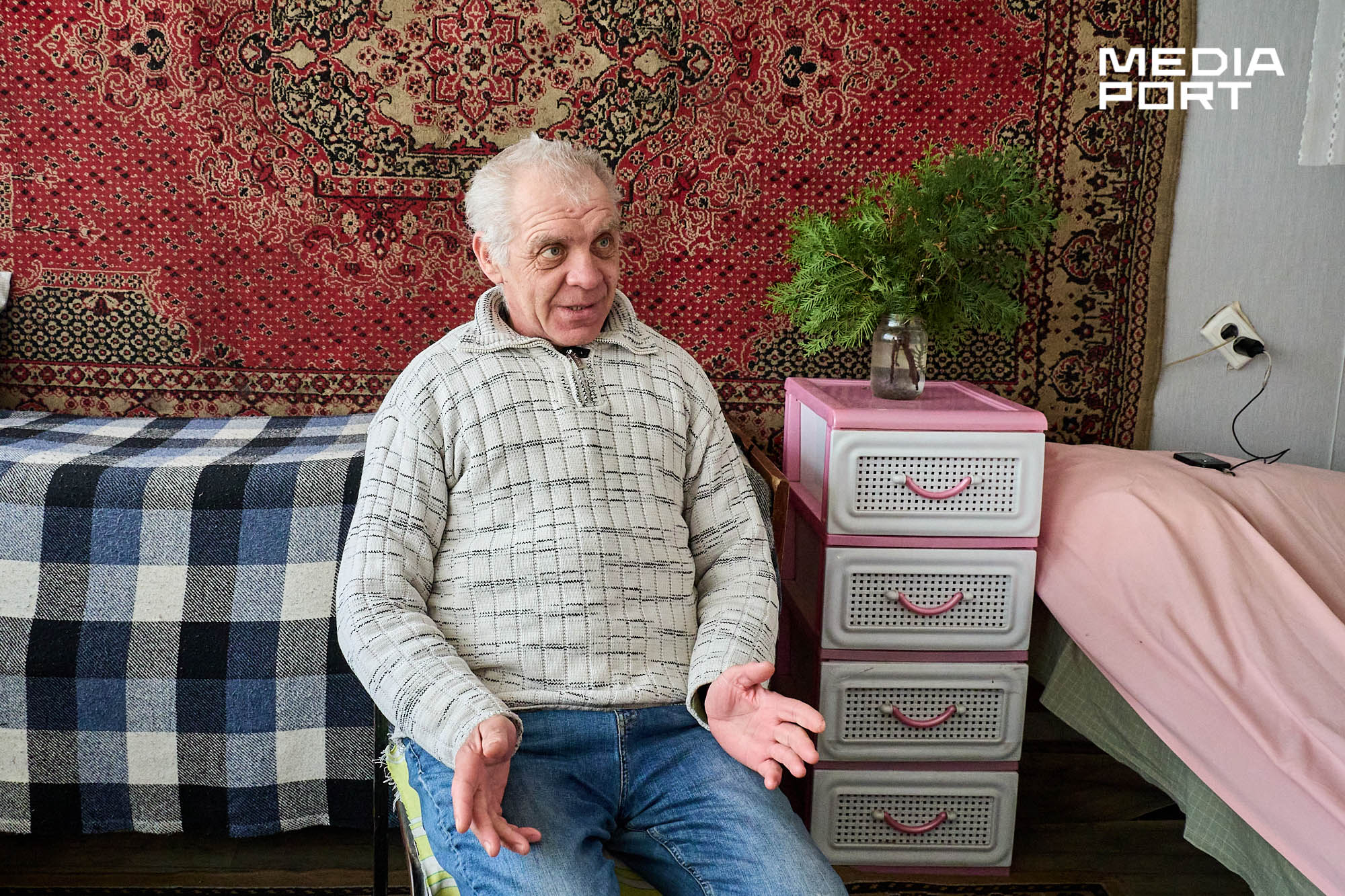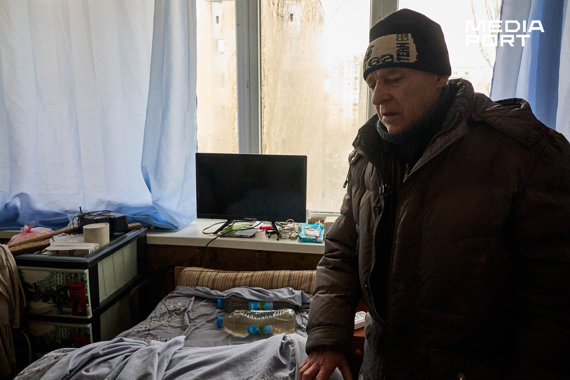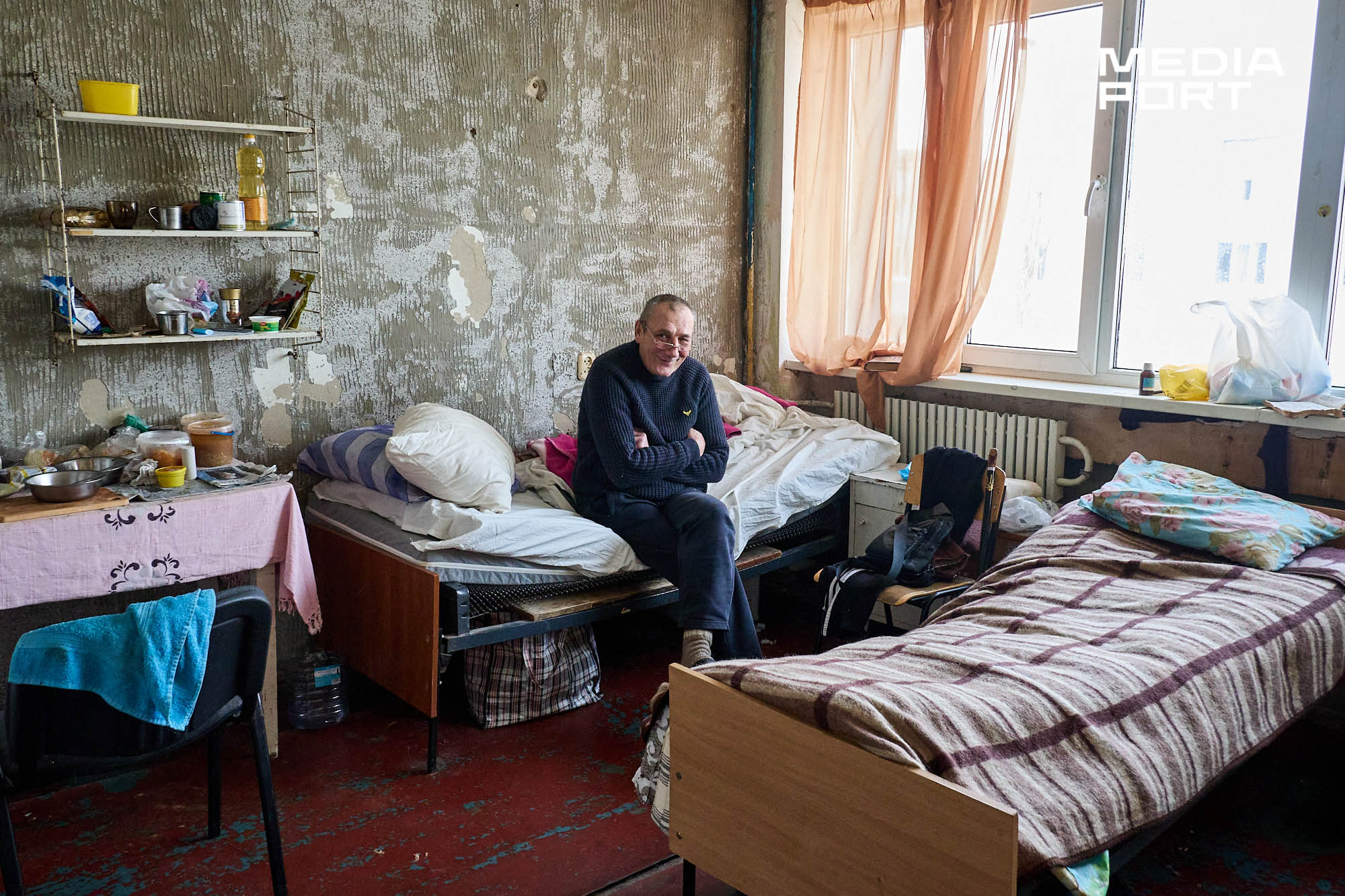 У Володимира Бухтіярова, переселенця з Куп’янська, кімната кутова. На вікнах — тонкий шар криги. Чоловік у куртці й шапці — так і спить останні дні.