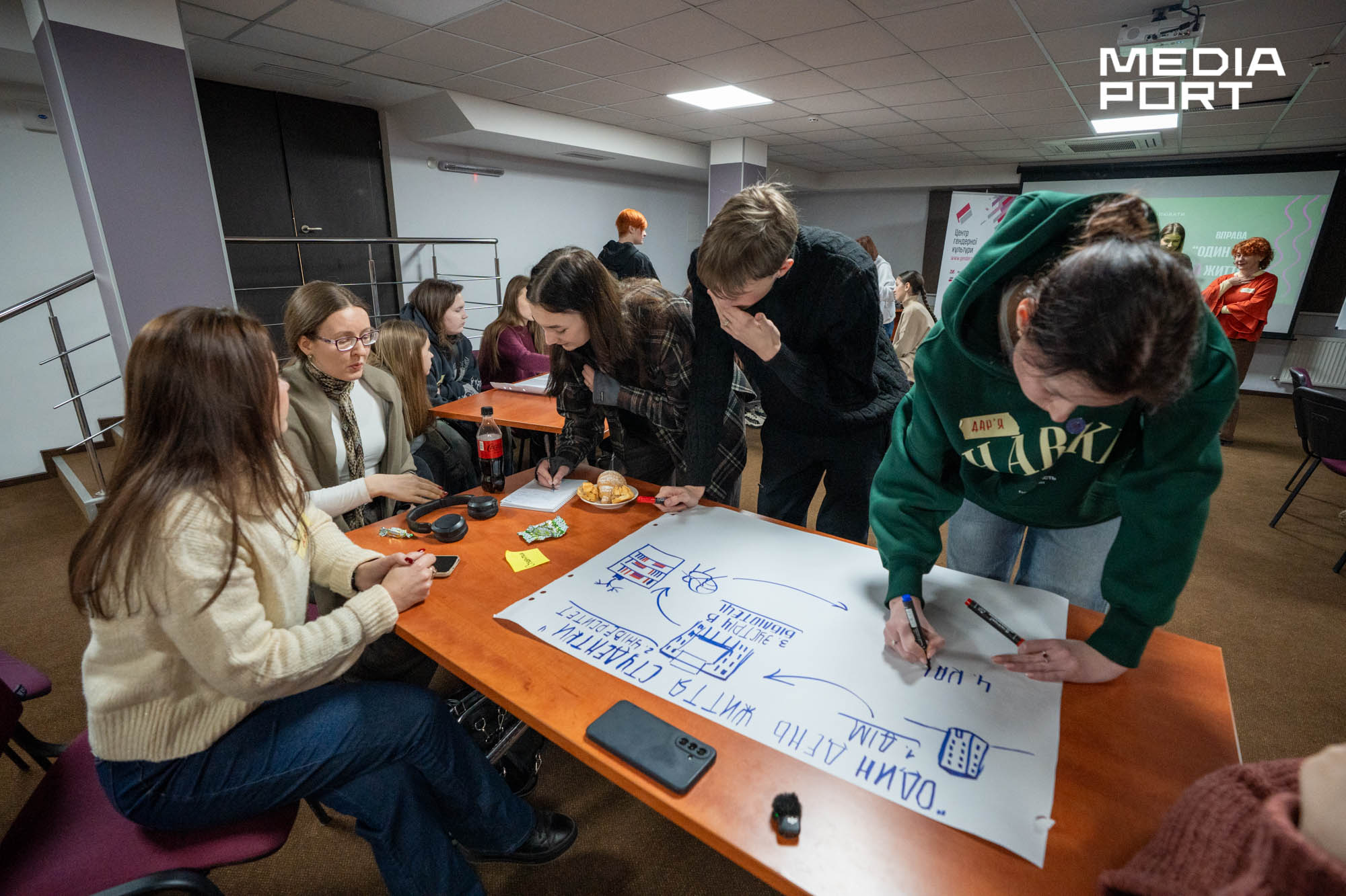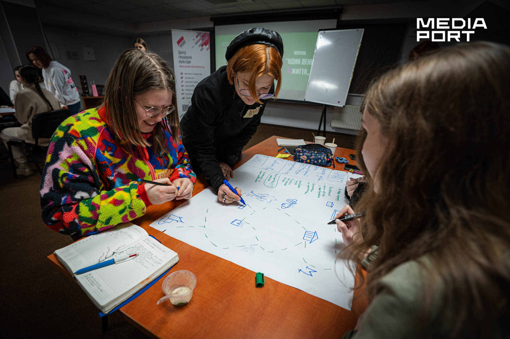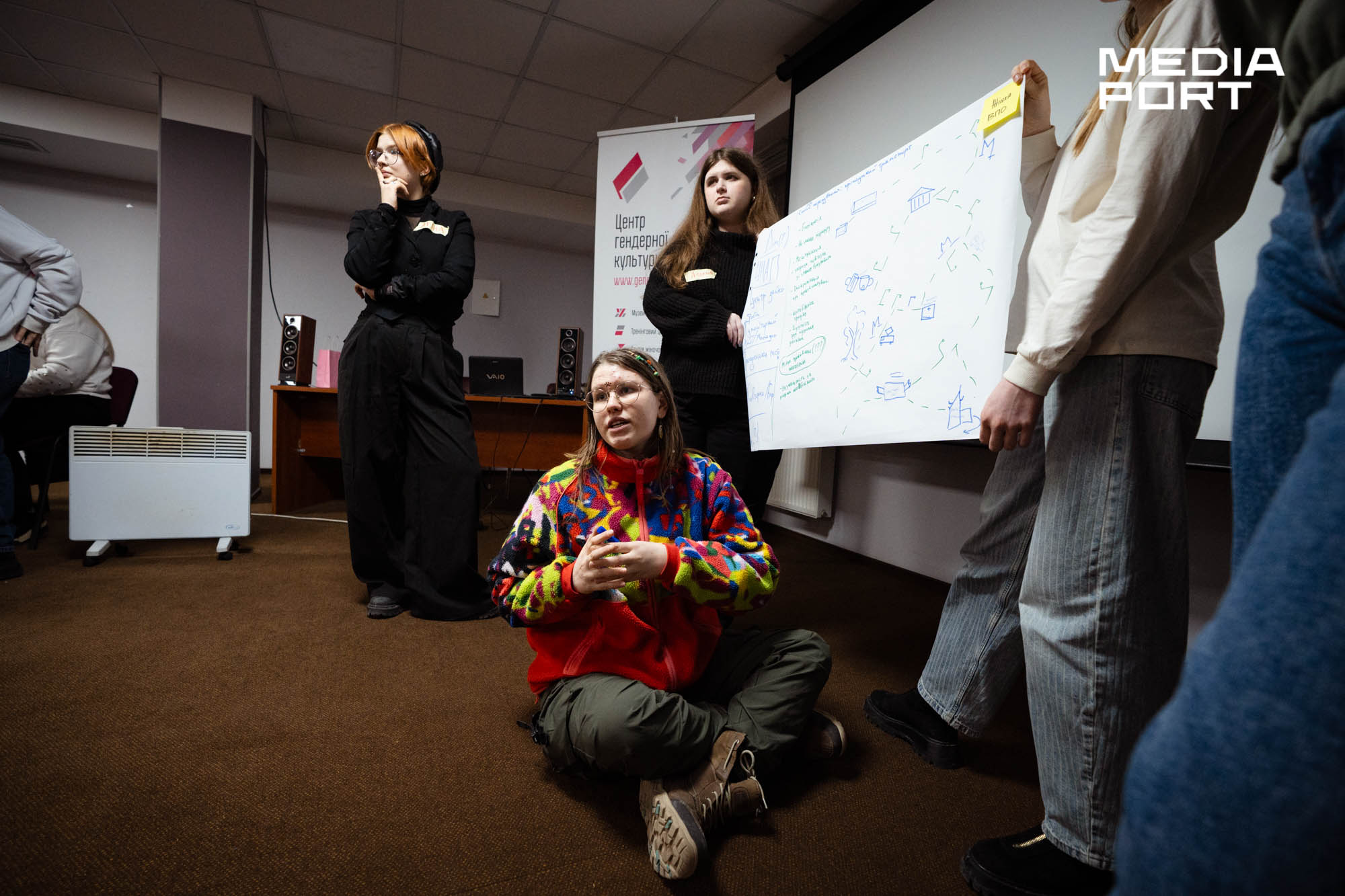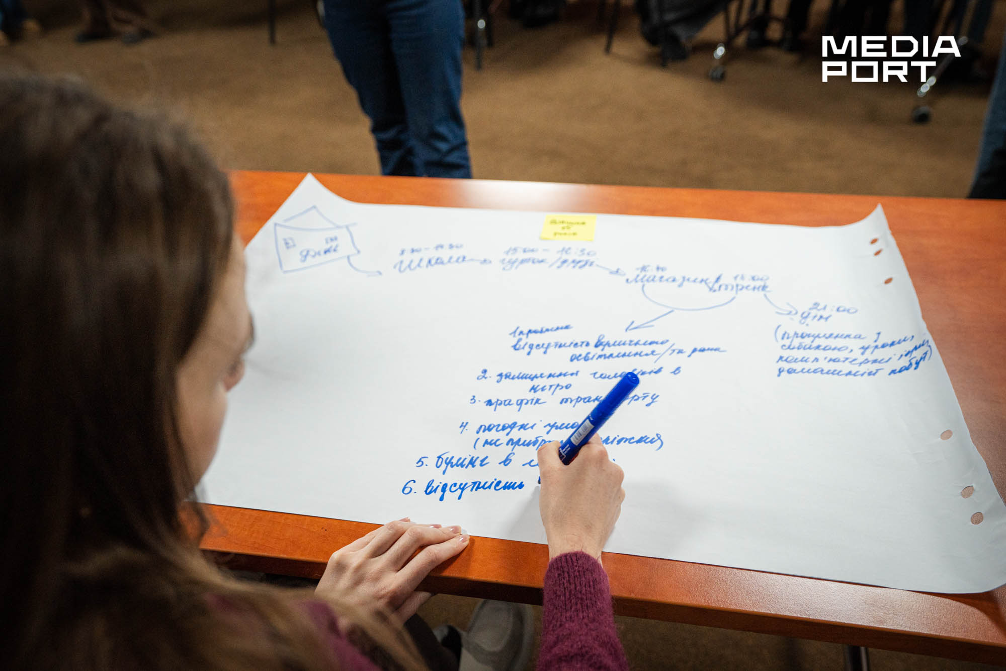 У приміщенні — декілька столів. За кожним — групи з 5-6 дівчат. На листах ватману — намальовані будинки, автобусні зупинки, дитячі майданчики і бібліотеки, а між ними — дороги та виклики. Поділившись на команди, учасниці аналізують маршрути уявних персонажок — матері з дитиною, студентки, тринадцятирічної дівчинки або жінки у колісному кріслі.