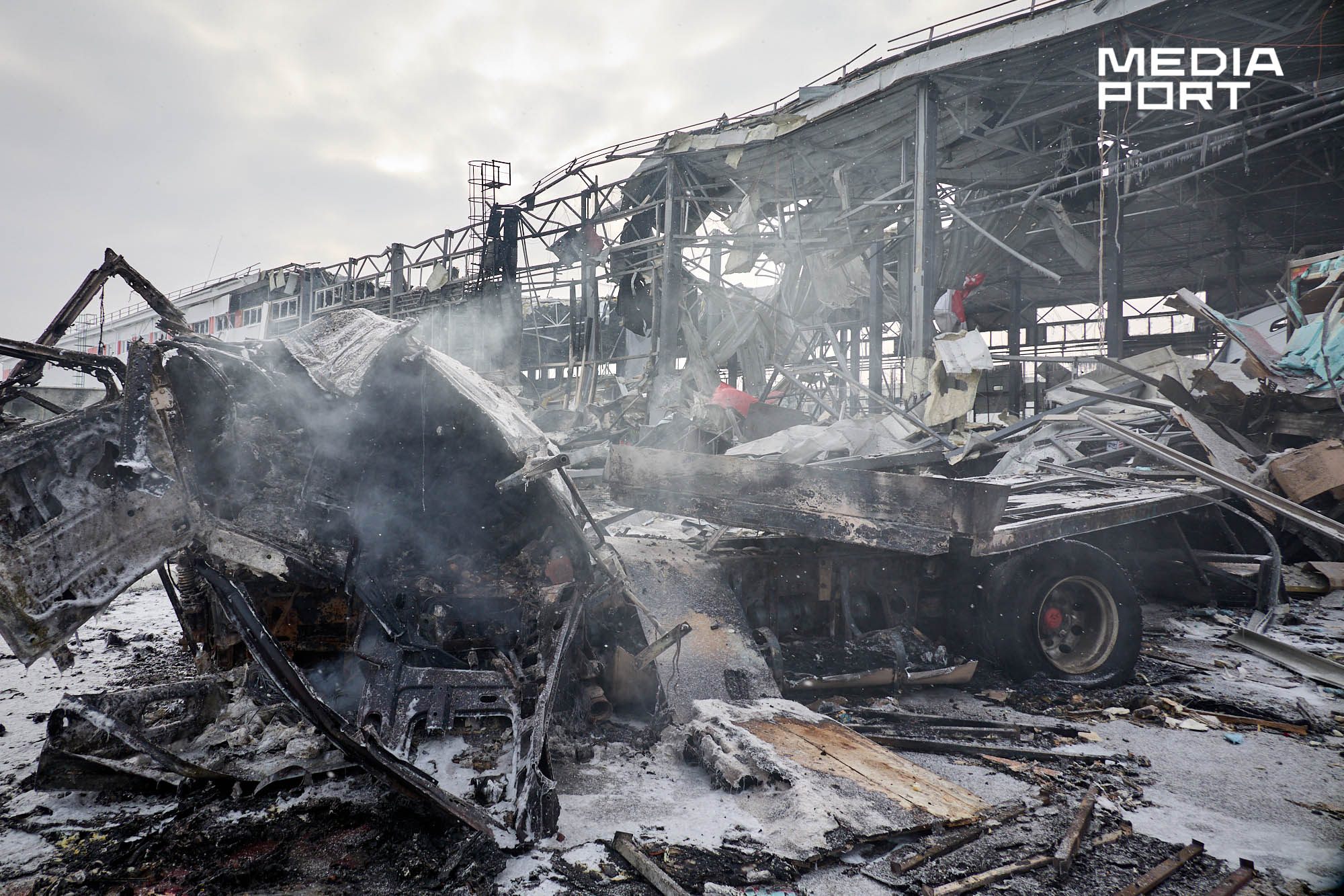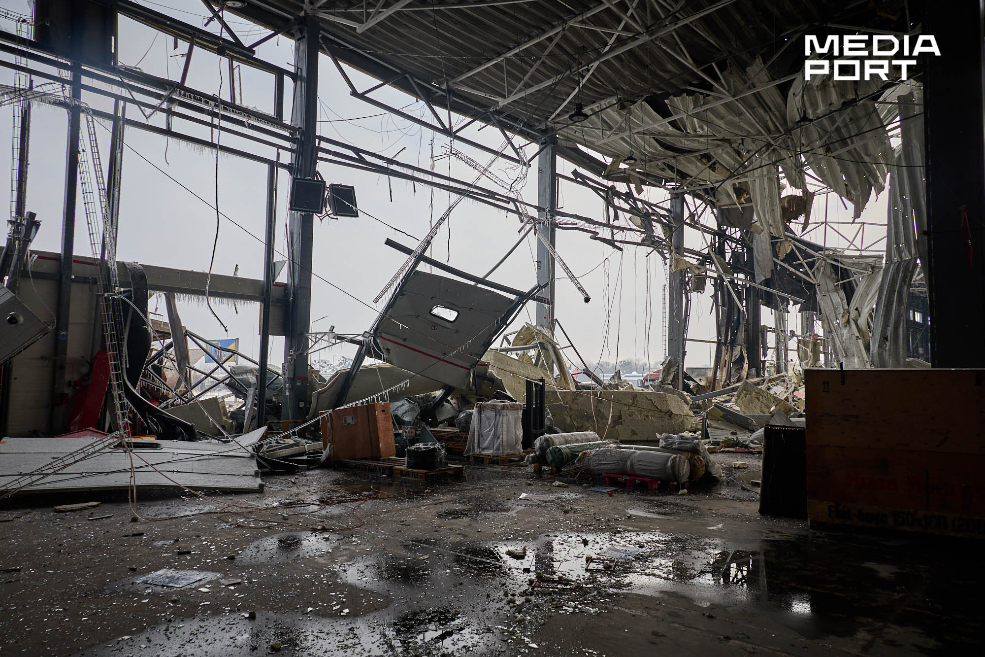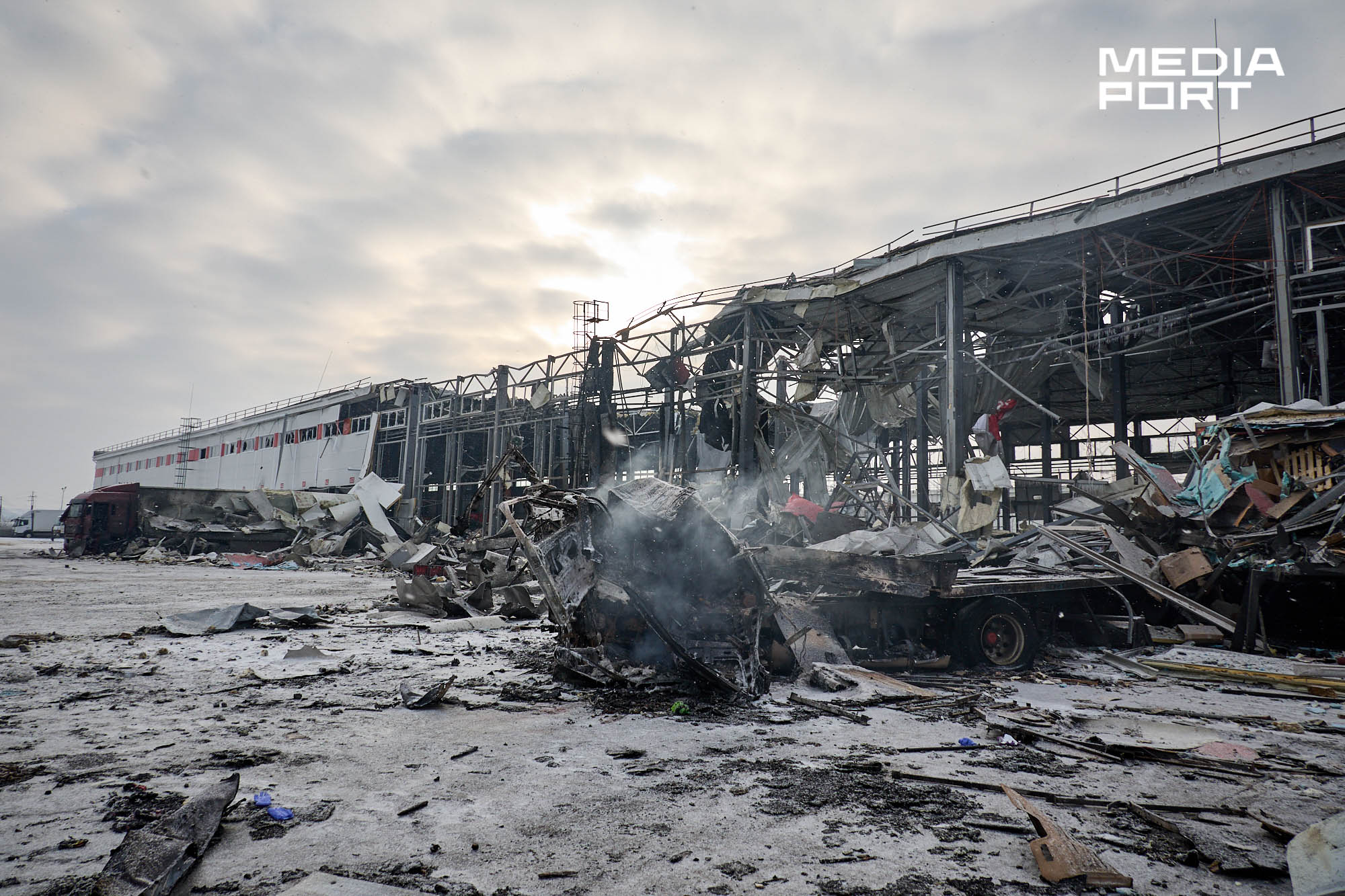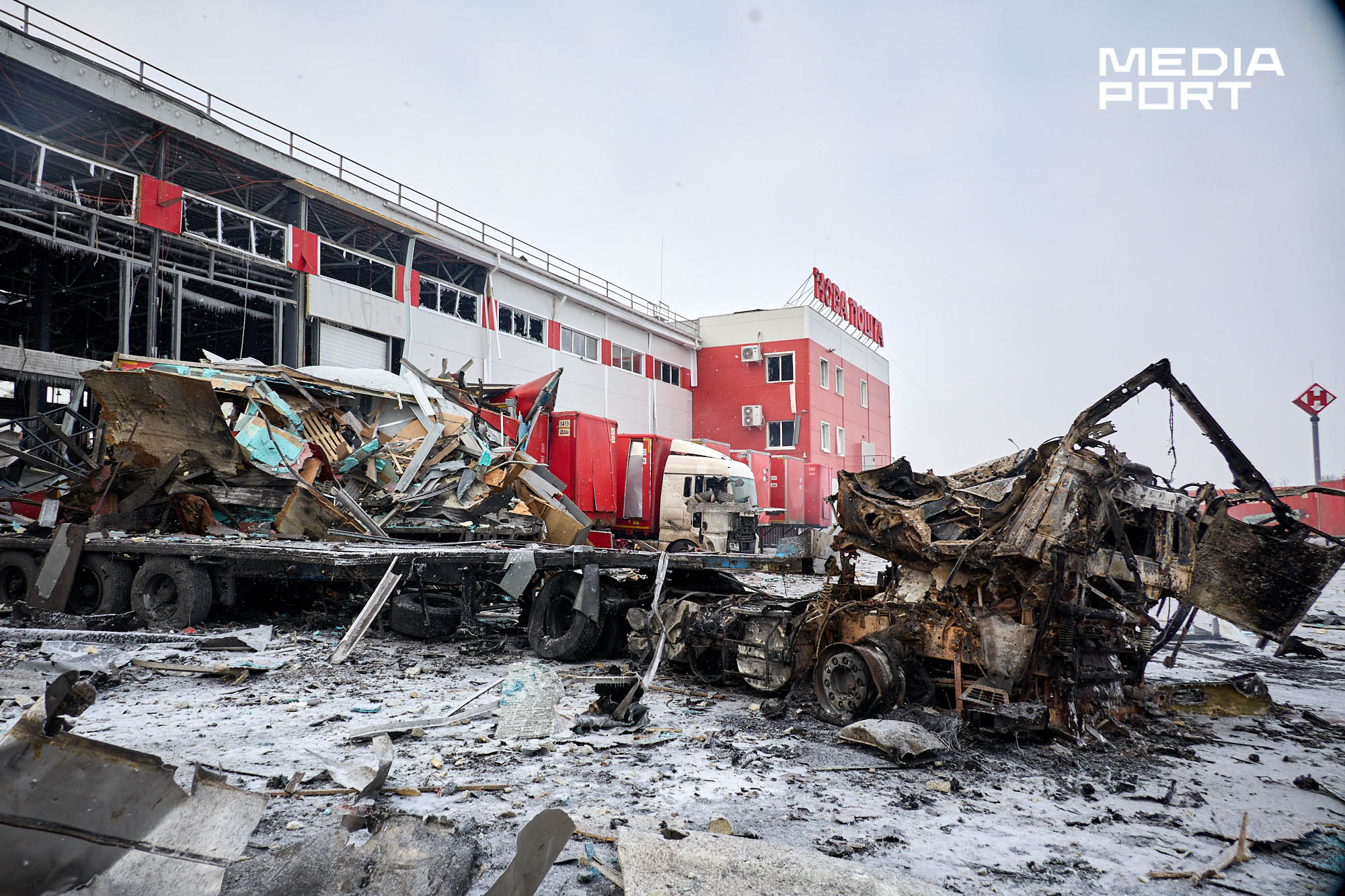 За повідомленням компанії, вантажний термінал Харківського інноваційного центру майже знищено, частково пошкоджено поштовий.
