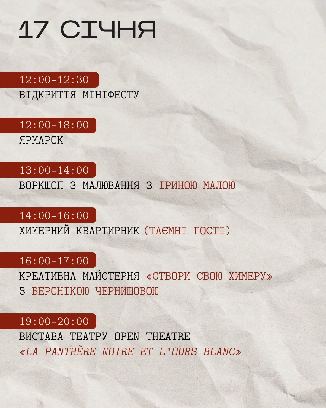 - 16:00-17:00 — креативна майстерня «Створи свою химеру» з Веронікою Чернишовою;