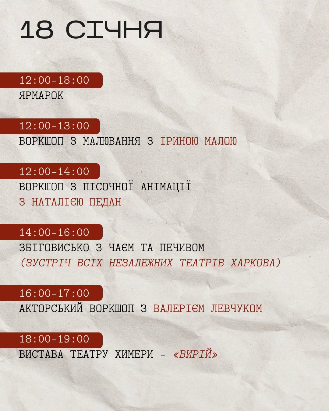 - 16:00-17:00 — акторський воркшоп з Валерієм Левчуком;