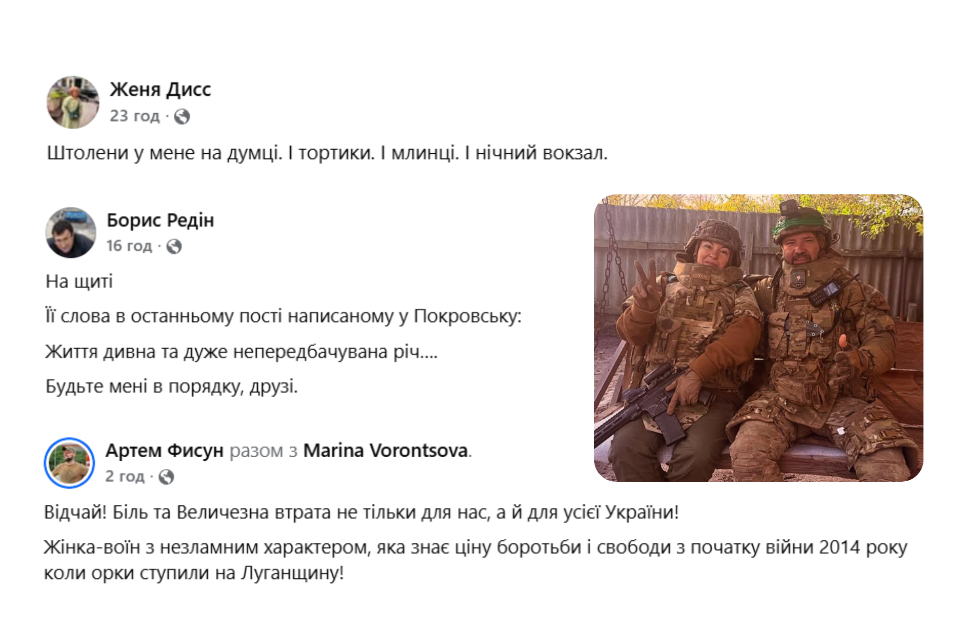 Друзі, колеги та побратими Марини Воронцової діляться спогадами про неї у соцмережах. На своїх сторінках вони пишуть про біль утрати, дякують Марині за її силу, щирість і роботу, яку вона виконувала до останнього дня.
