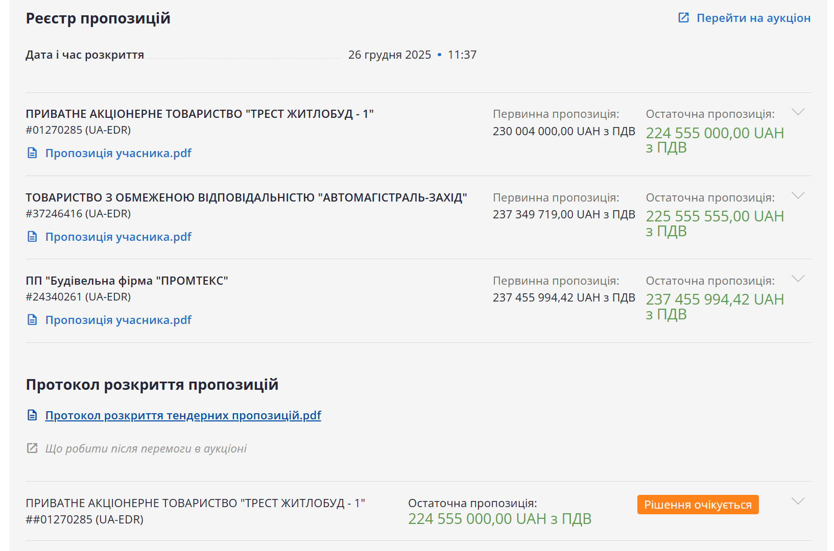 - ПП «Будівельна фірма «Промтекс», яка запропонувала виконати роботи за 237,4 млн грн.