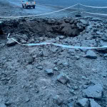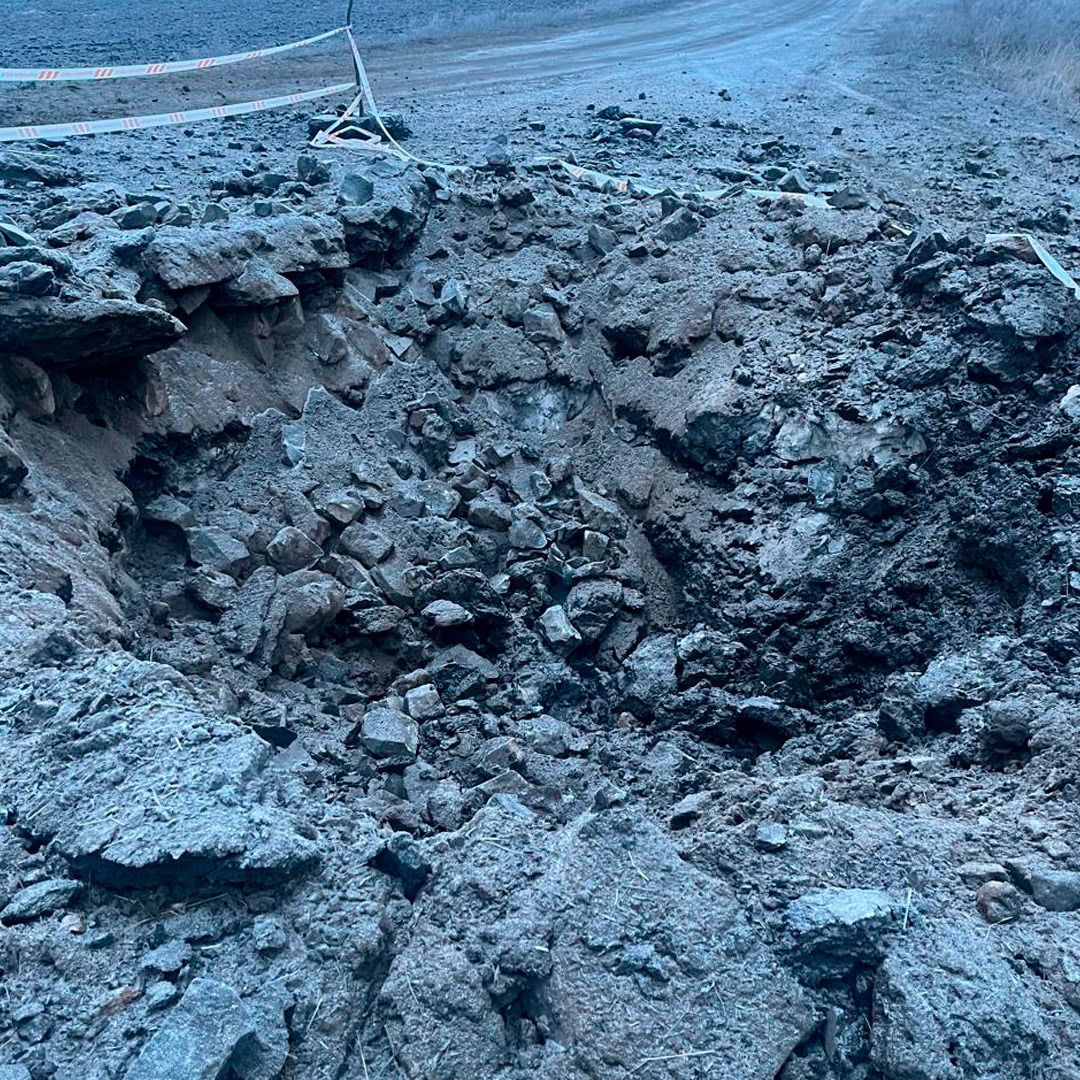 Ракетний удар залишив на дорозі поблизу селища Золочів глибоку вирву, потрощив асфальт. Шляховики зазначають, що пошкодження могло створювати загрозу для транспорту.