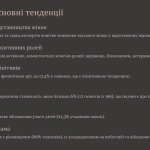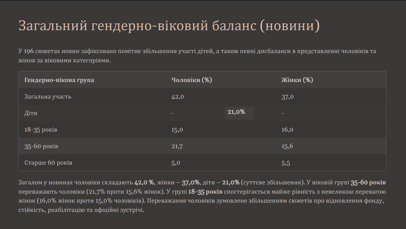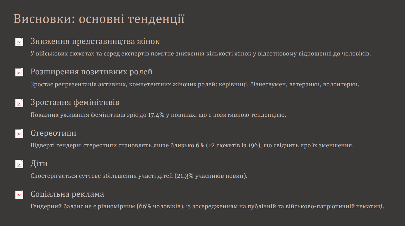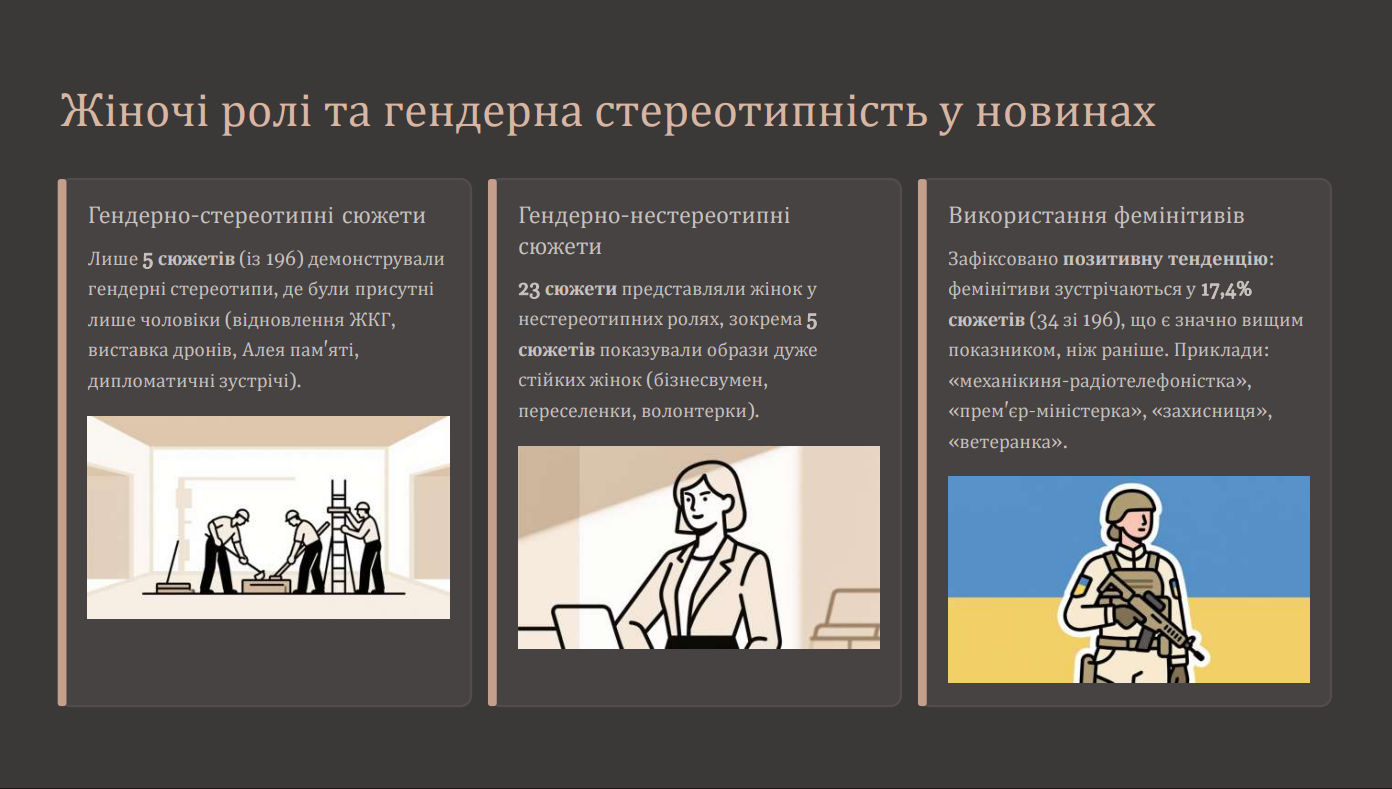 Дослідження відзначило більшу репрезентацію активних, компетентних жіночих ролей: керівниці, бізнесвумен, ветеранки, волонтерки. При цьому відверті гендерні стереотипи транслюються лише в 6% новин (12 сюжетів із 196), що свідчить про їх зменшення.