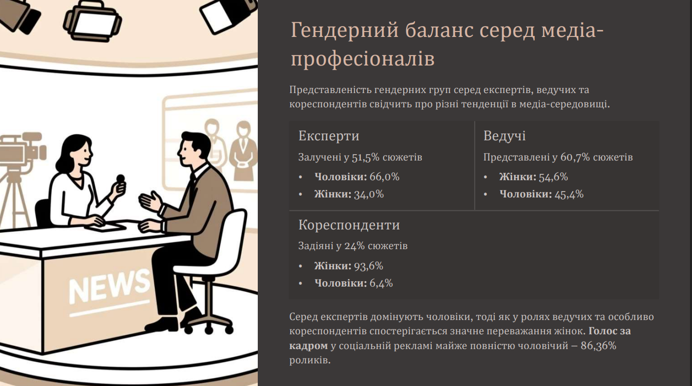 «Думка чоловіків-експертів звучить у 51,5% сюжетів. Серед експертів чоловіки переважають: їх залученість становила 66,0%, а жінок — 34,0%. Однак у ролях ведучих та особливо кореспондентів спостерігається значне переважання жінок. Позитивною тенденцією є також те, що показник уживання фемінітивів зріс до 17,4% у новинах», — йдеться у висновках моніторингу.