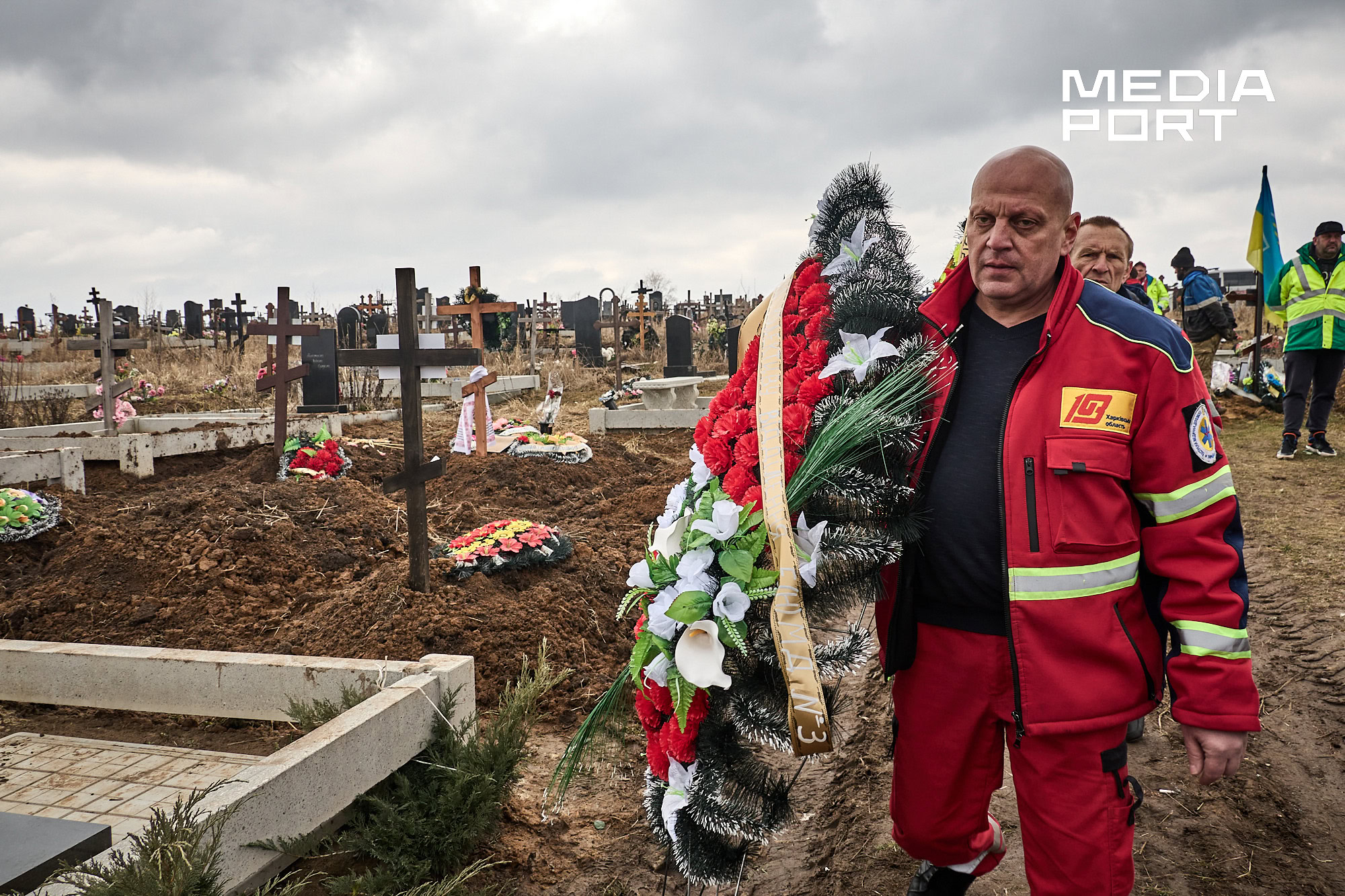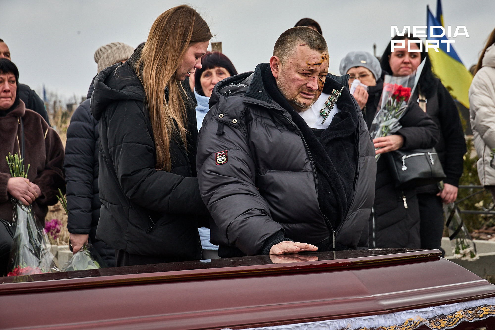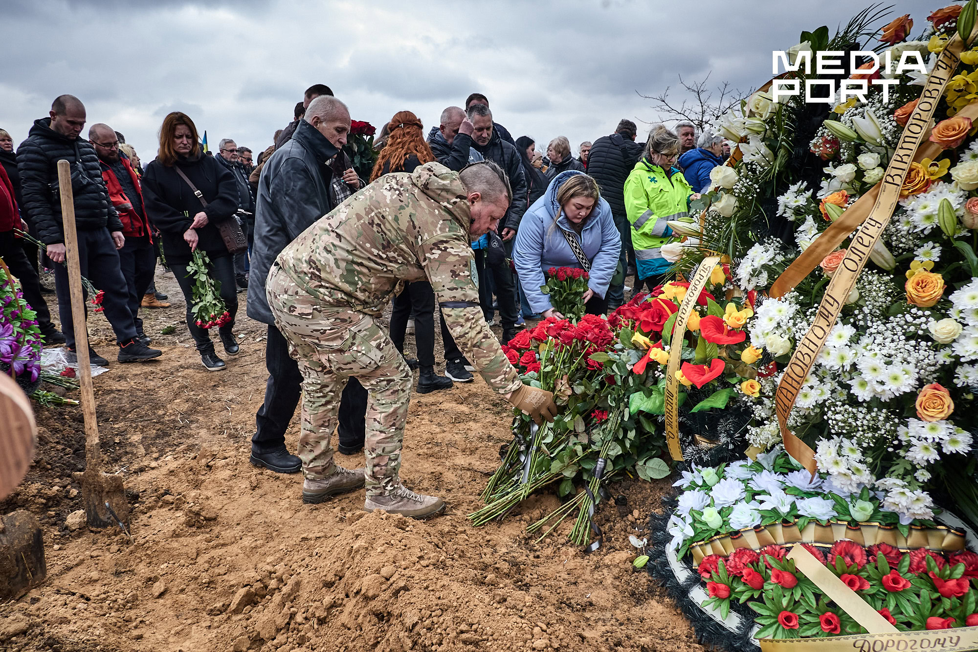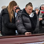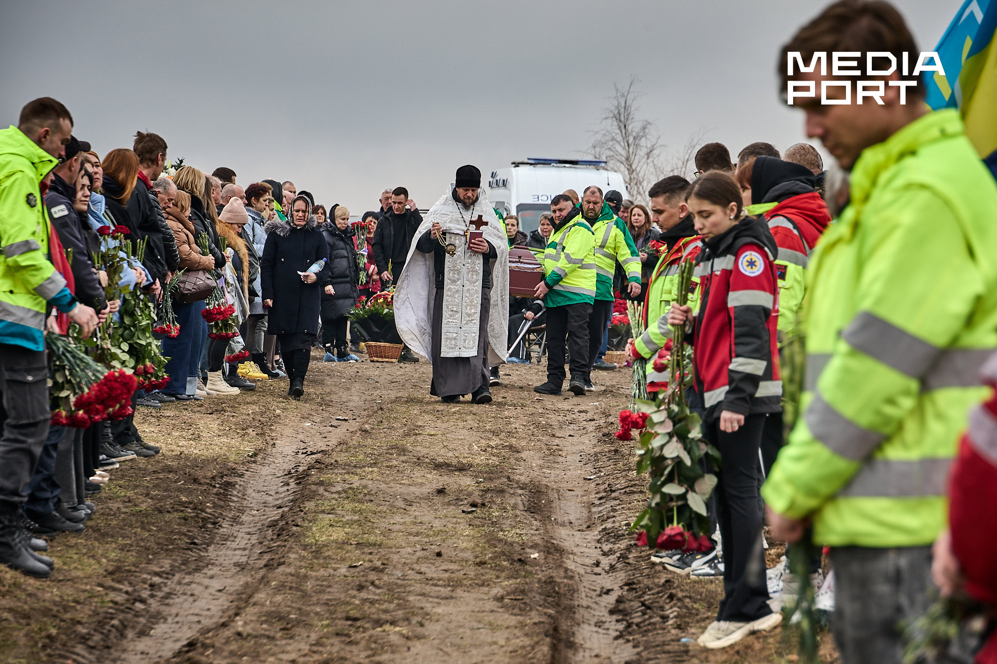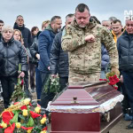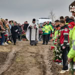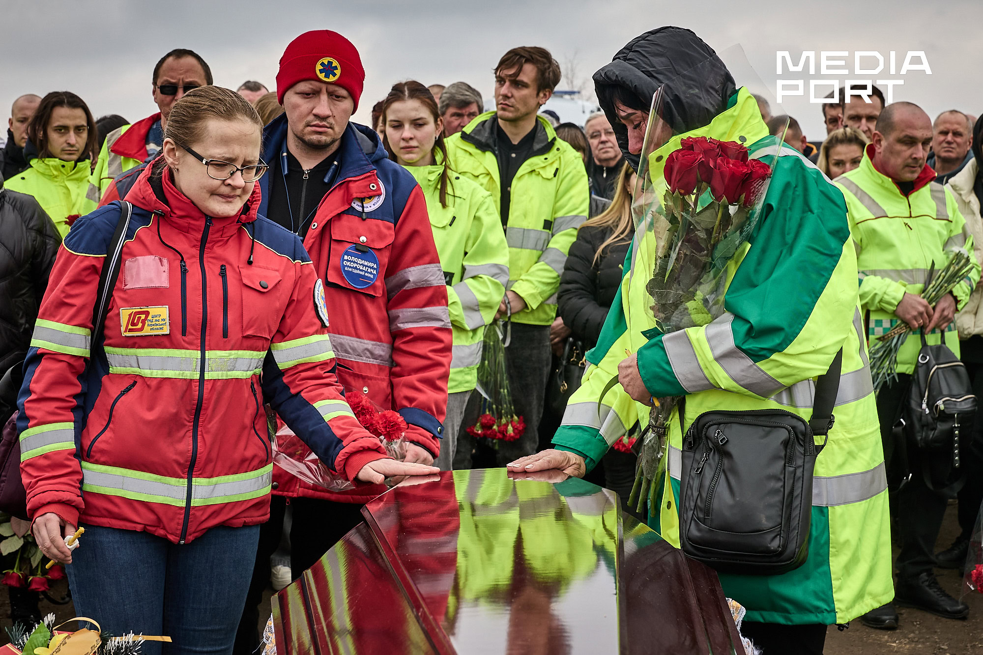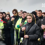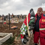 Попрощатися з Олегом Журавльовим прийшли близькі, друзі, колеги. Серед присутніх — парамедик Олександр Дудулад, єдиний з членів екіпажу, хто уцілів під час удару 15 березня. Він має травми тіла, посічене уламками обличчя, та попри це приїхав на прощання — віддати шану напарнику.