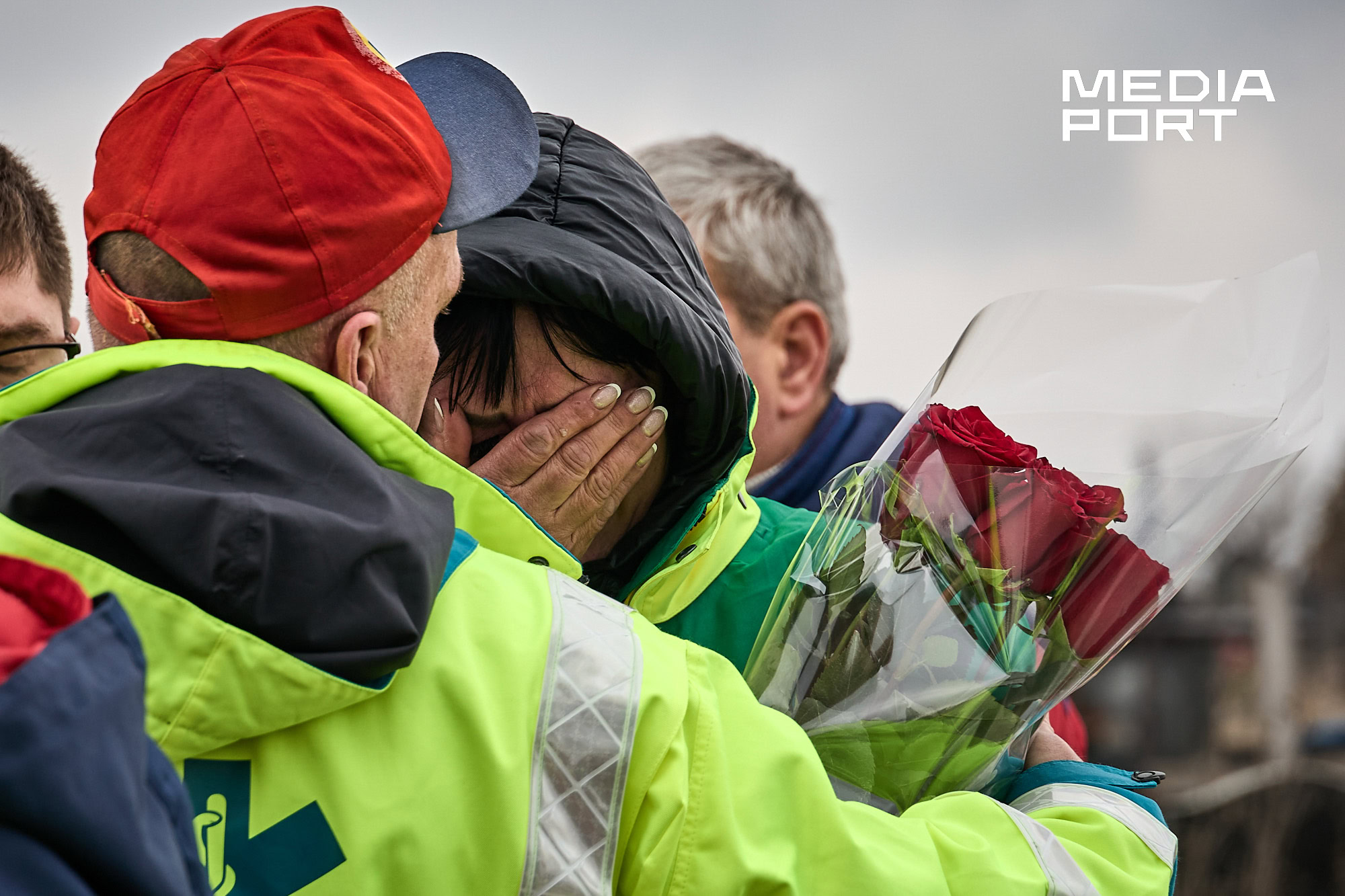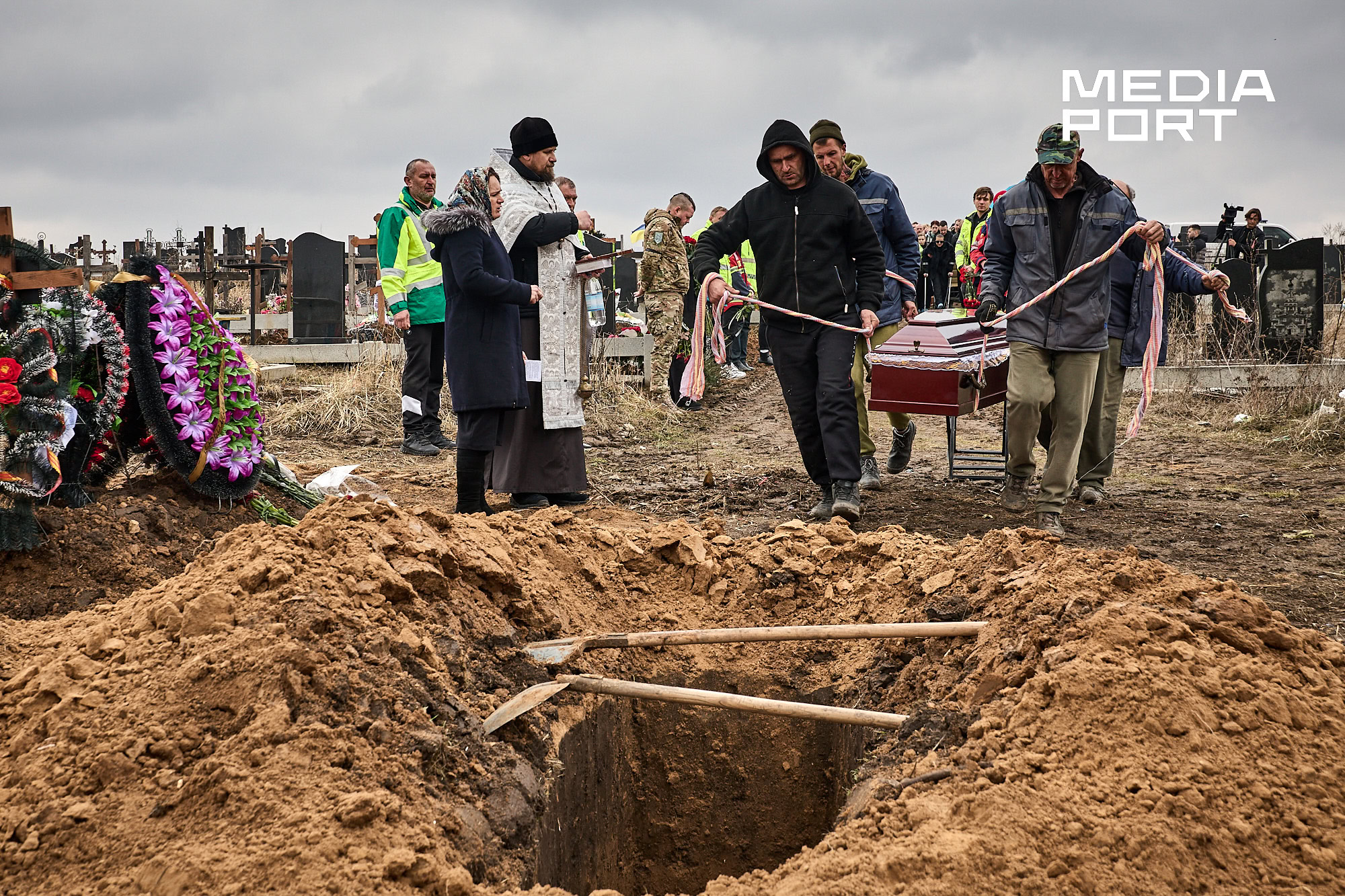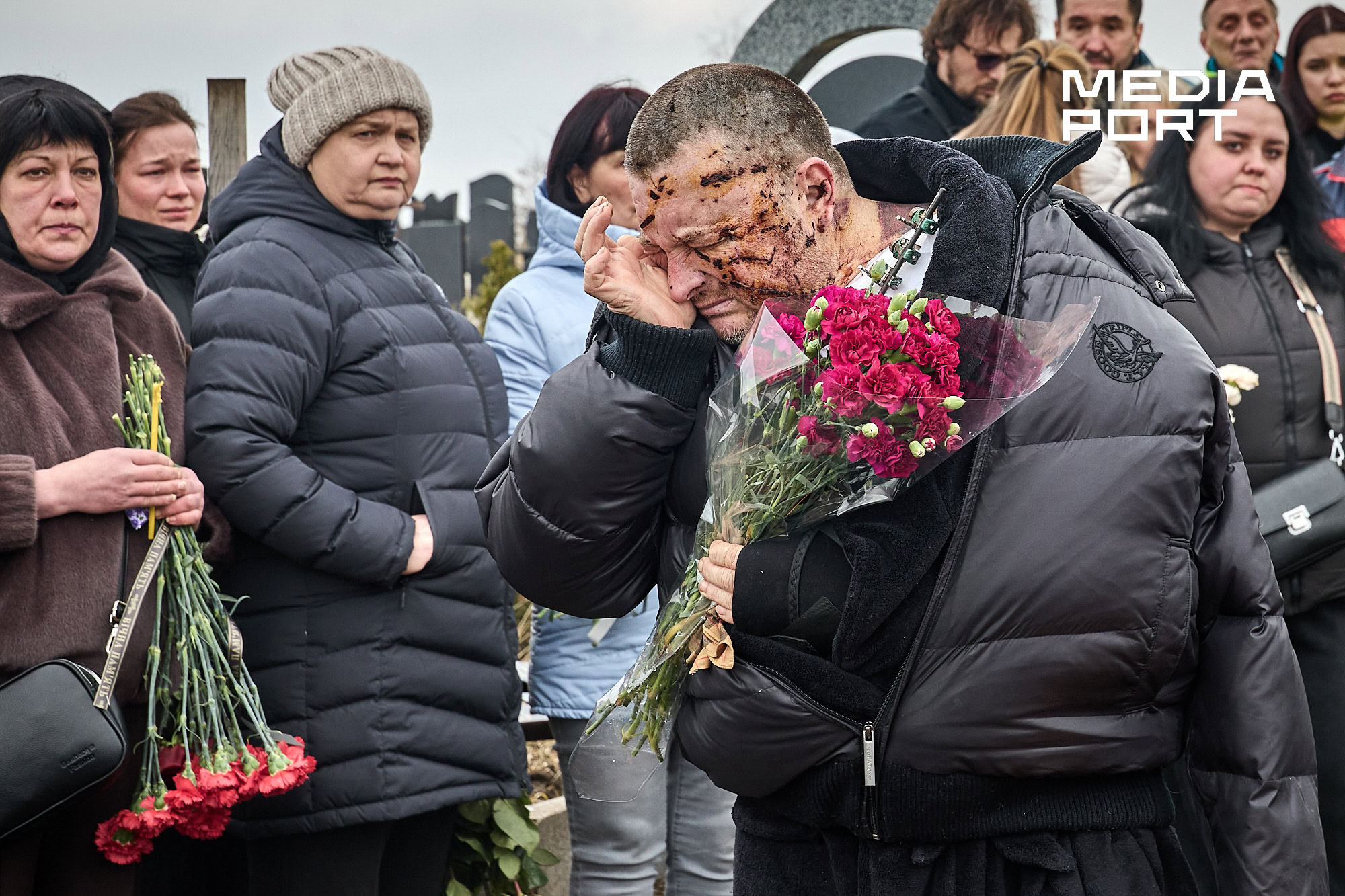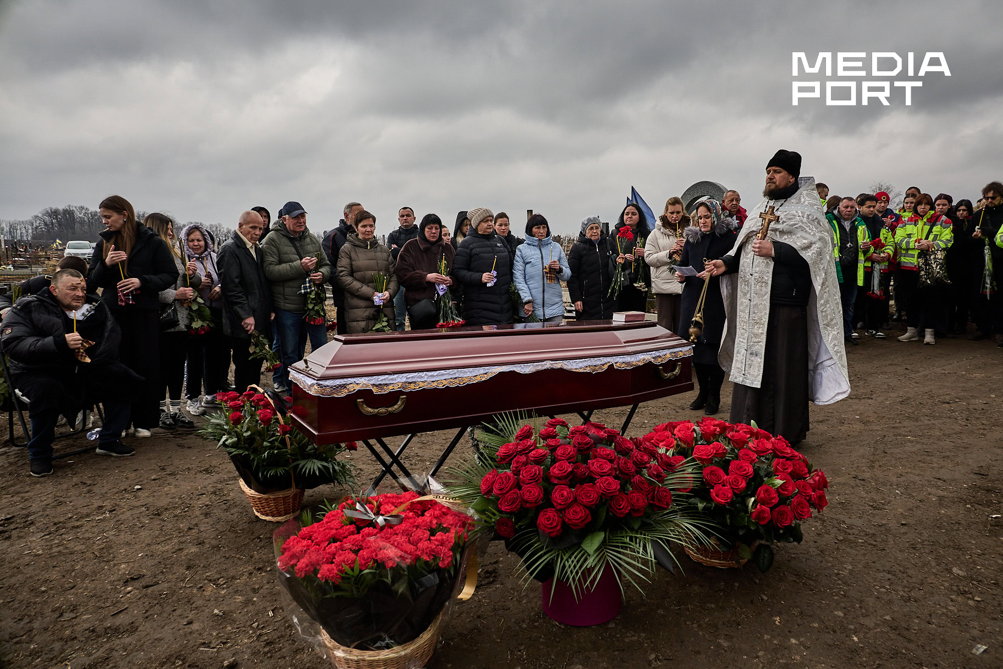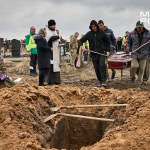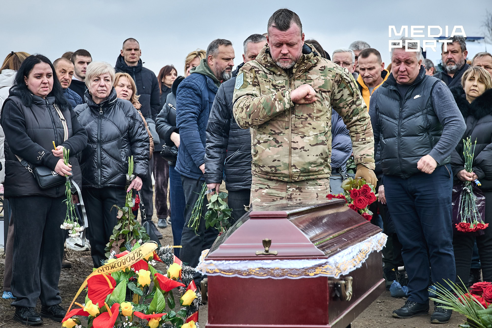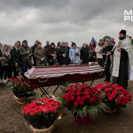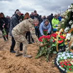 Попрощатися з Олегом Журавльовим прийшли близькі, друзі, колеги. Серед присутніх — парамедик Олександр Дудулад, єдиний з членів екіпажу, хто уцілів під час удару 15 березня. Він має травми тіла, посічене уламками обличчя, та попри це приїхав на прощання — віддати шану напарнику.