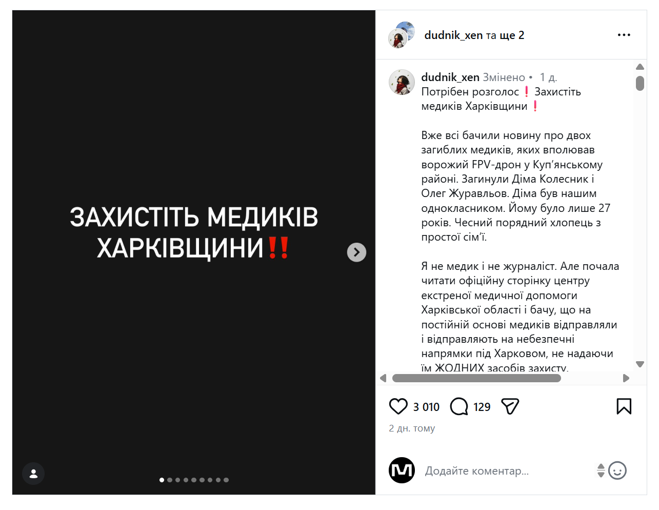 Однокласниця загиблого Дмитра Колесника та його друзі поширюють у соцмережах допис, в якому просять надати розголос питанню захисту бригад швидкої.