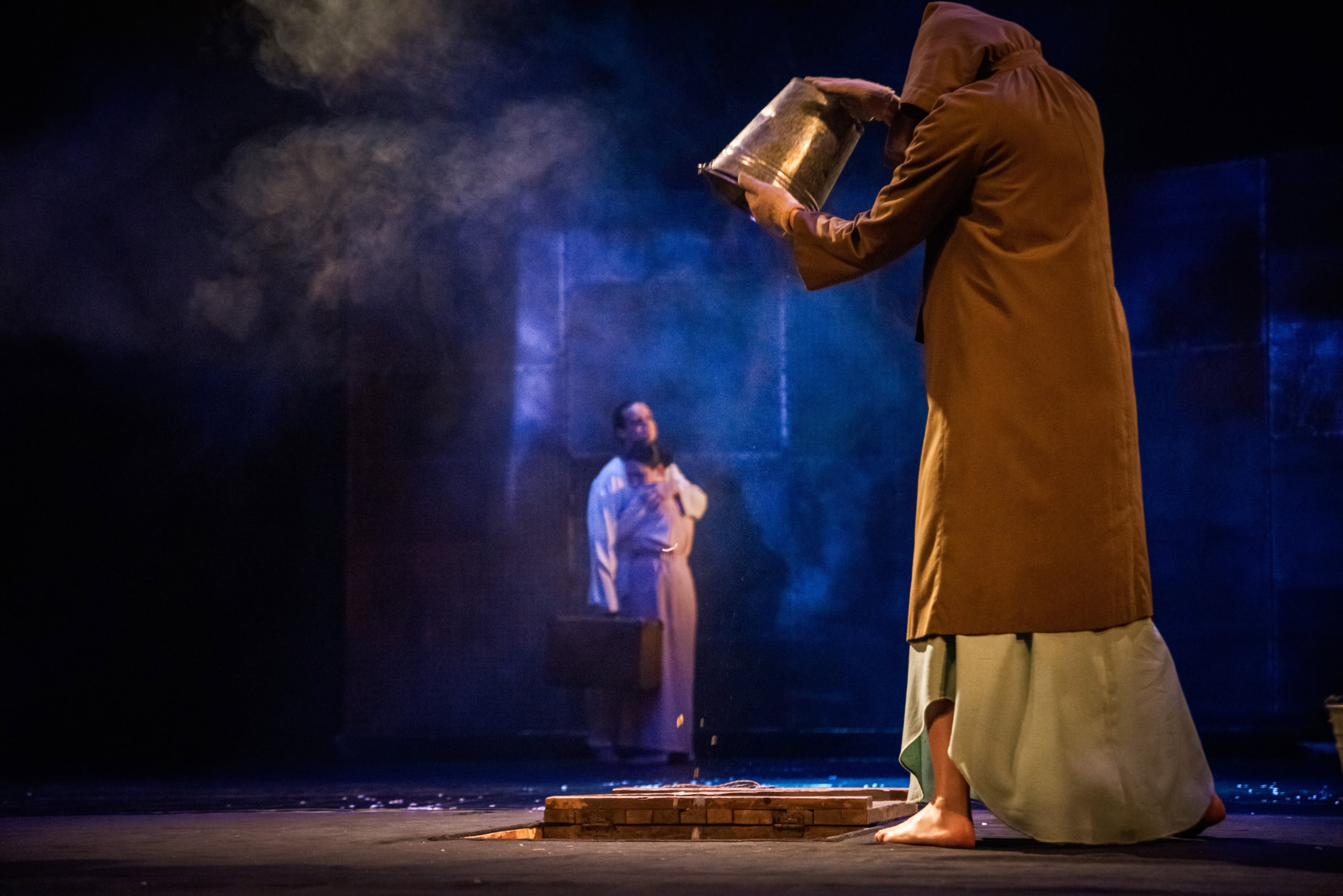 Вже перша загадкова мізансцена, напевно, може слугувати прологом і своєрідним ключем для інтерпретації цілого. Перед нами мовчазний екстатичний діалог двох незнайомців. Вони здаються схожими, але вони різні. Два всесвіти, між якими розіпʼяте наше життя. Театральна сцена мимоволі стає прірвою — нездоланним водорозділом між ними. Актори обмінюються не словами, а жестами та рухами, незрозумілими посланнями, тягнуться один до одного, але один одного не здатні досягти. Між ними — безодня.