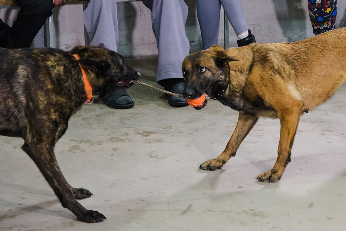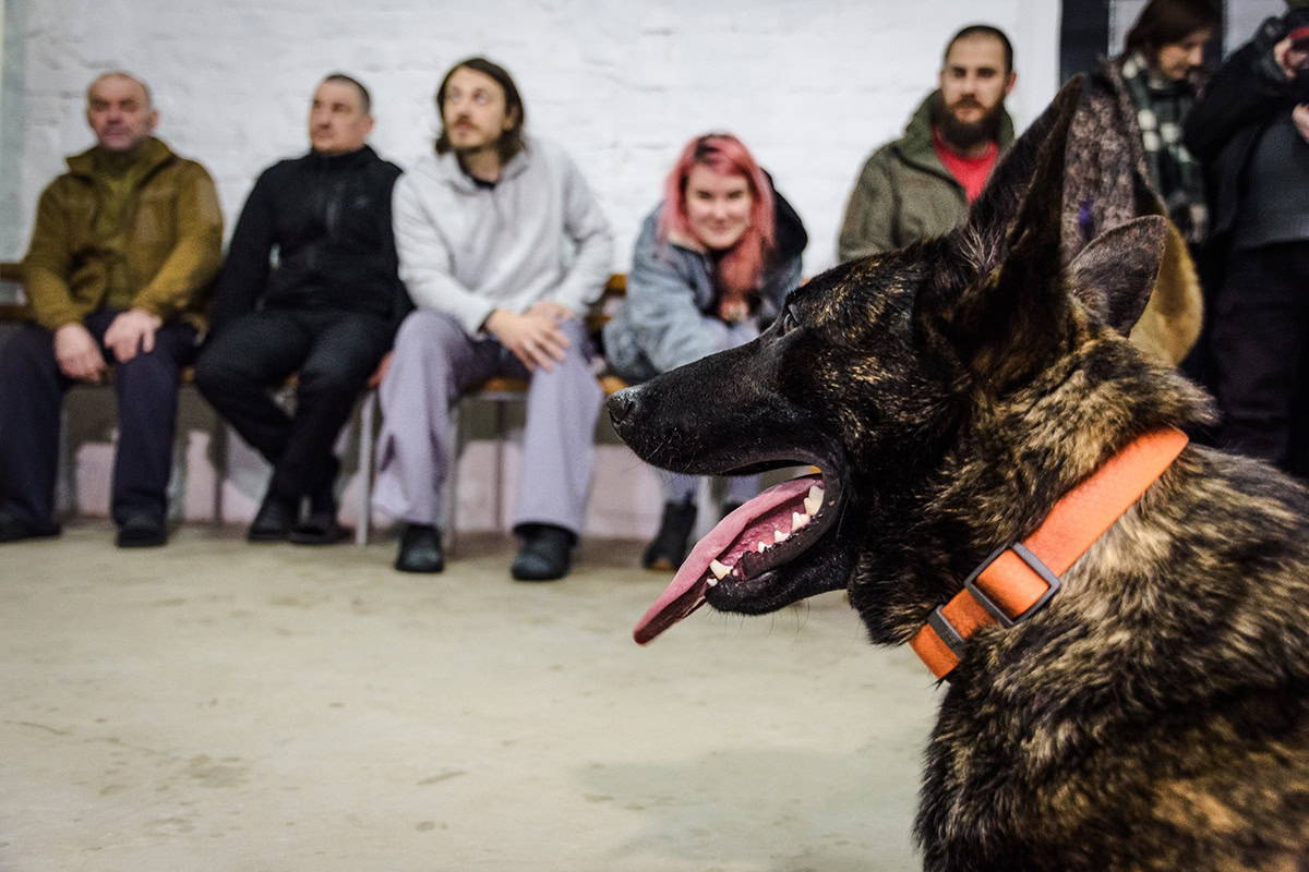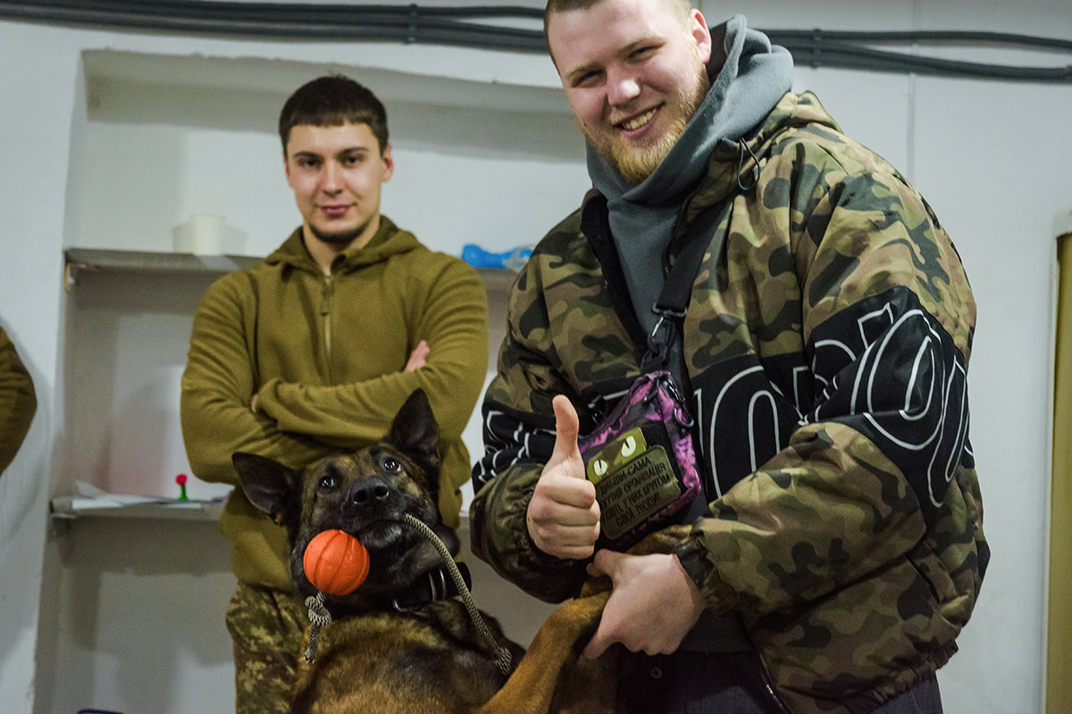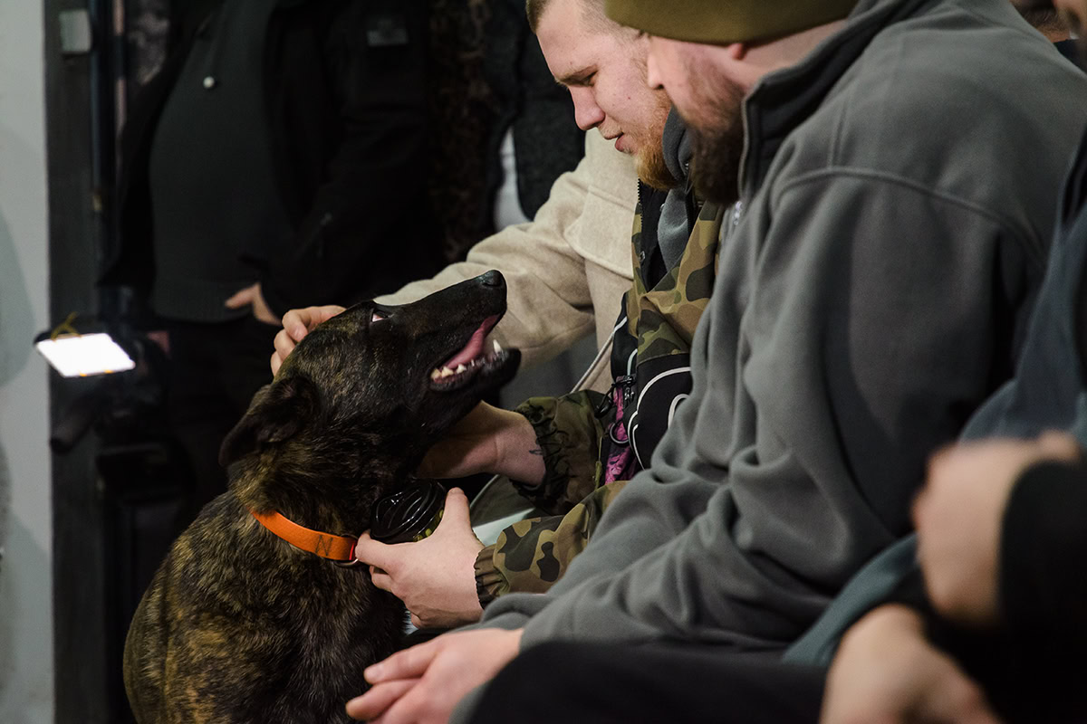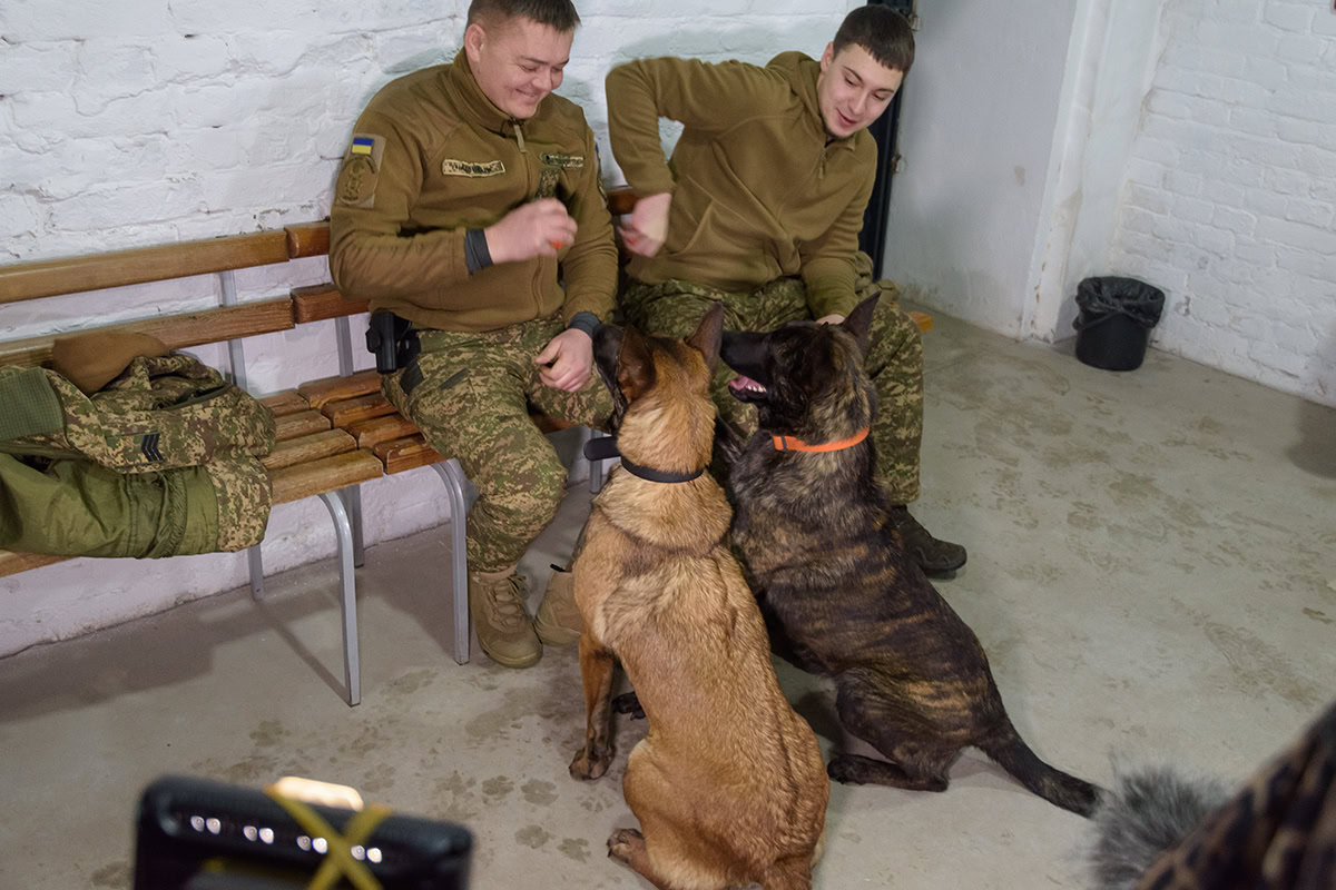 До бійців привезли двох службових собак: Слім — голландська вівчарка, Бігі — бельгійська вівчарка малінуа. Обидва — чемпіони України серед службових собак у різних номінаціях.