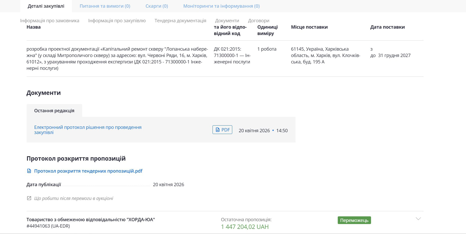 Договір на 1,44 млн грн уклали з переможцем тендеру — ТОВ «Хорда-ЮА», зареєстрованим у Харкові.