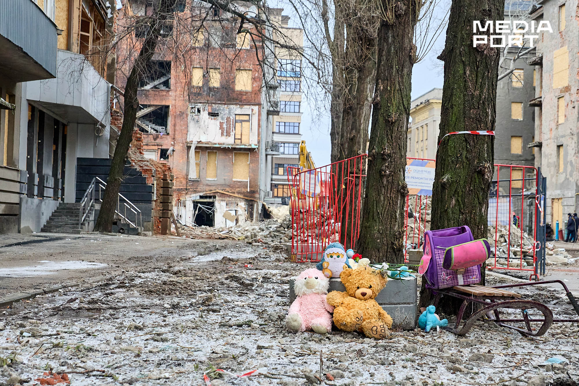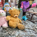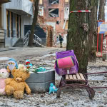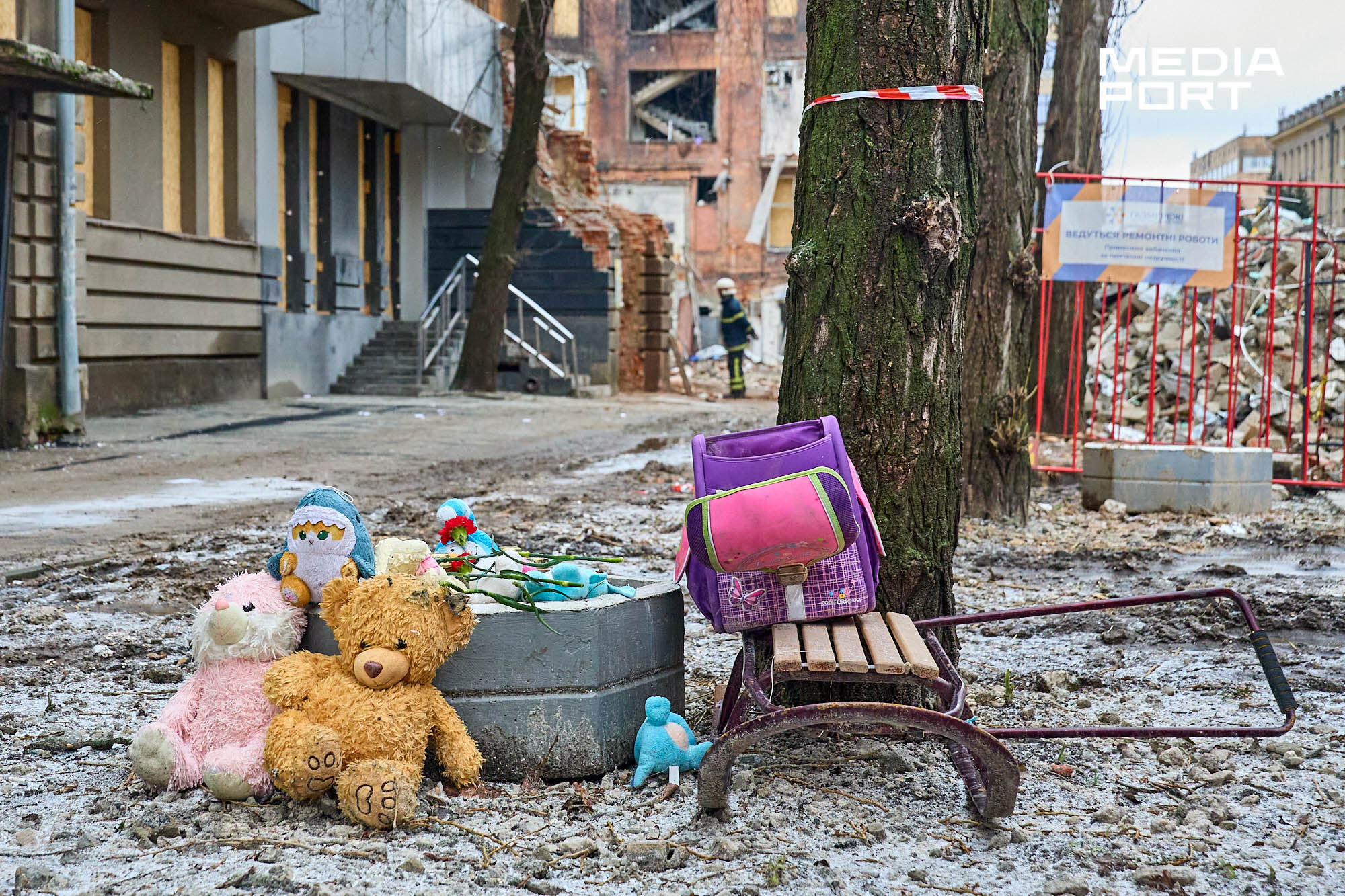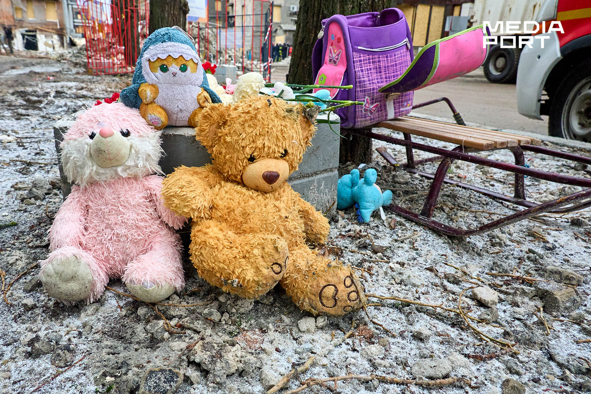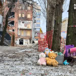 Після вибухів біля пошкодженої багатоповерхівки утворився імпровізований меморіал. Рятувальники склали біля будівлі іграшки, санчата та дитячий рюкзак, які дістали з-під завалів. У пам’ять про загиблих містяни також принесли квіти та іграшки.