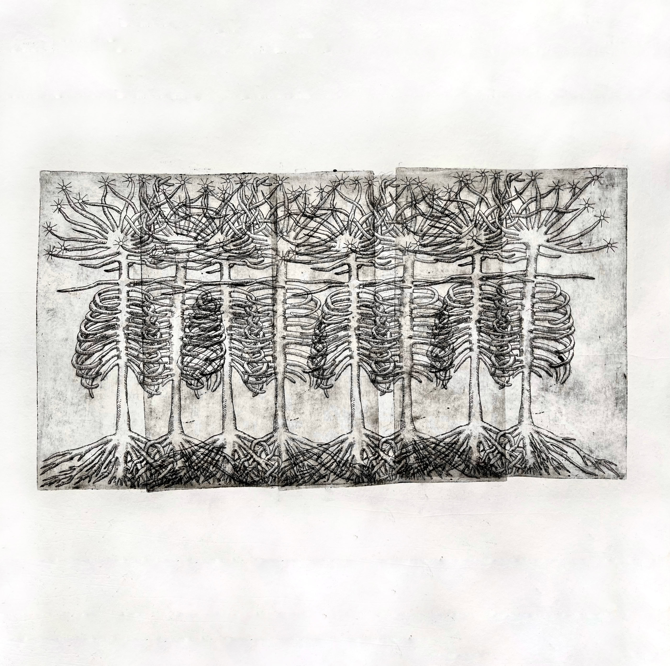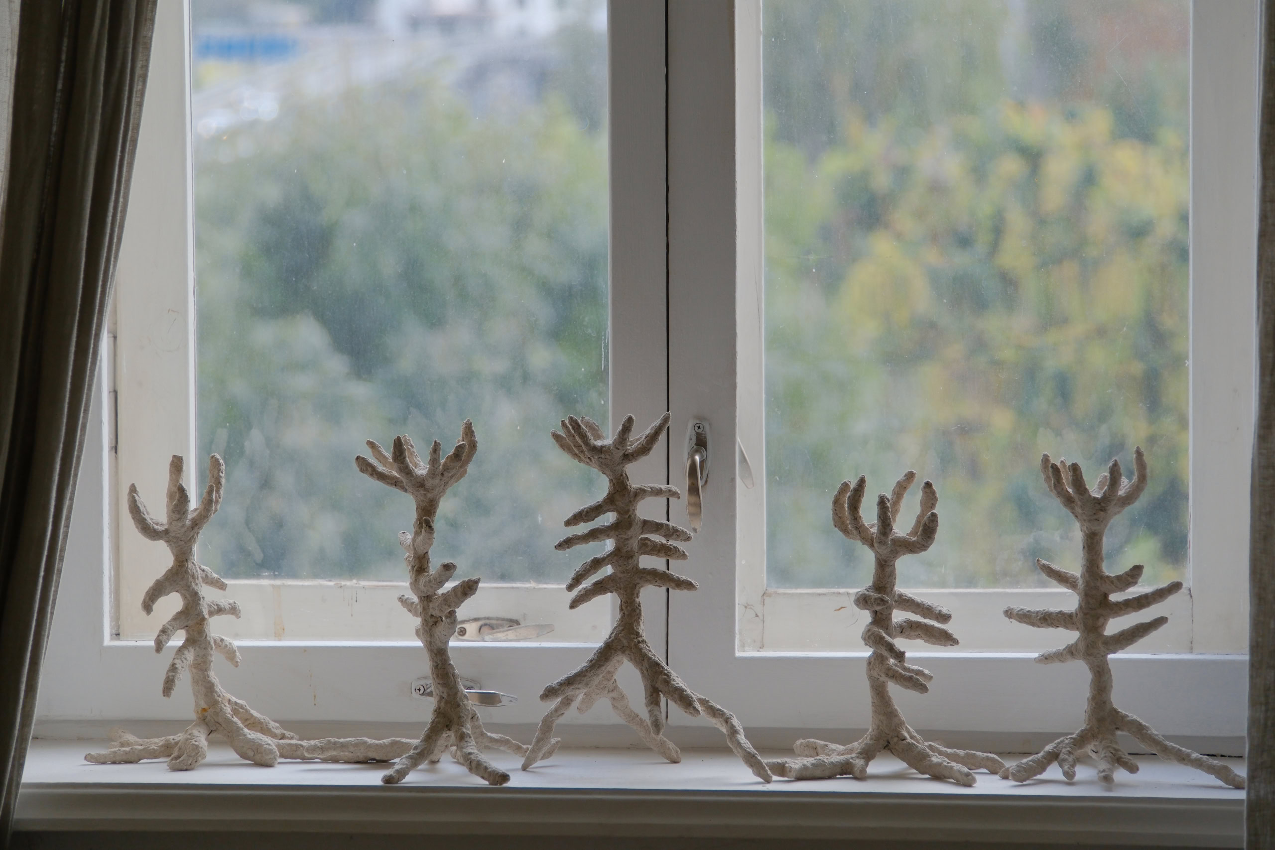 Десь рік тому в мене була виставка на схожу тему — зі скульптурами, графікою. Це був початок роздумів про те, що щастя зникає, і мені хотілося б передати патологічність цього стану. Тоді в мене були дивні вироби: фауноподібні квітки з ребрами, кістки, каркаси. І відтоді я це «варю» в голові. Потім почала робити скульптури з міцелію — і додався момент живого організму. Бо гриб — він живий, він заростає, а коли я фіксую форму, коли він виріс так, як треба, я його вбиваю: засушую в духовці. І виходить, що це буквально мертвий організм — майже як скам’янілість, але результат нашої спільної роботи.