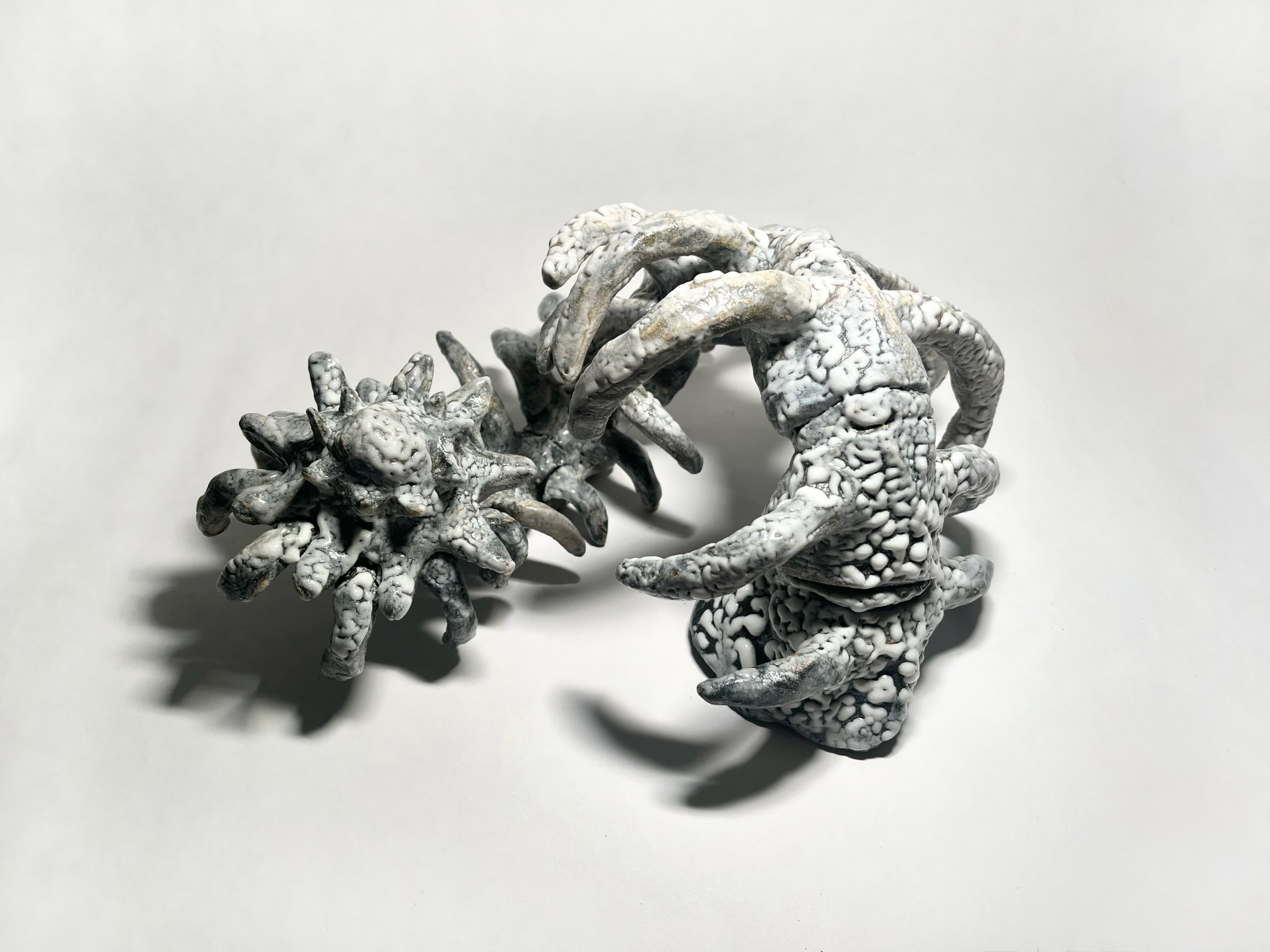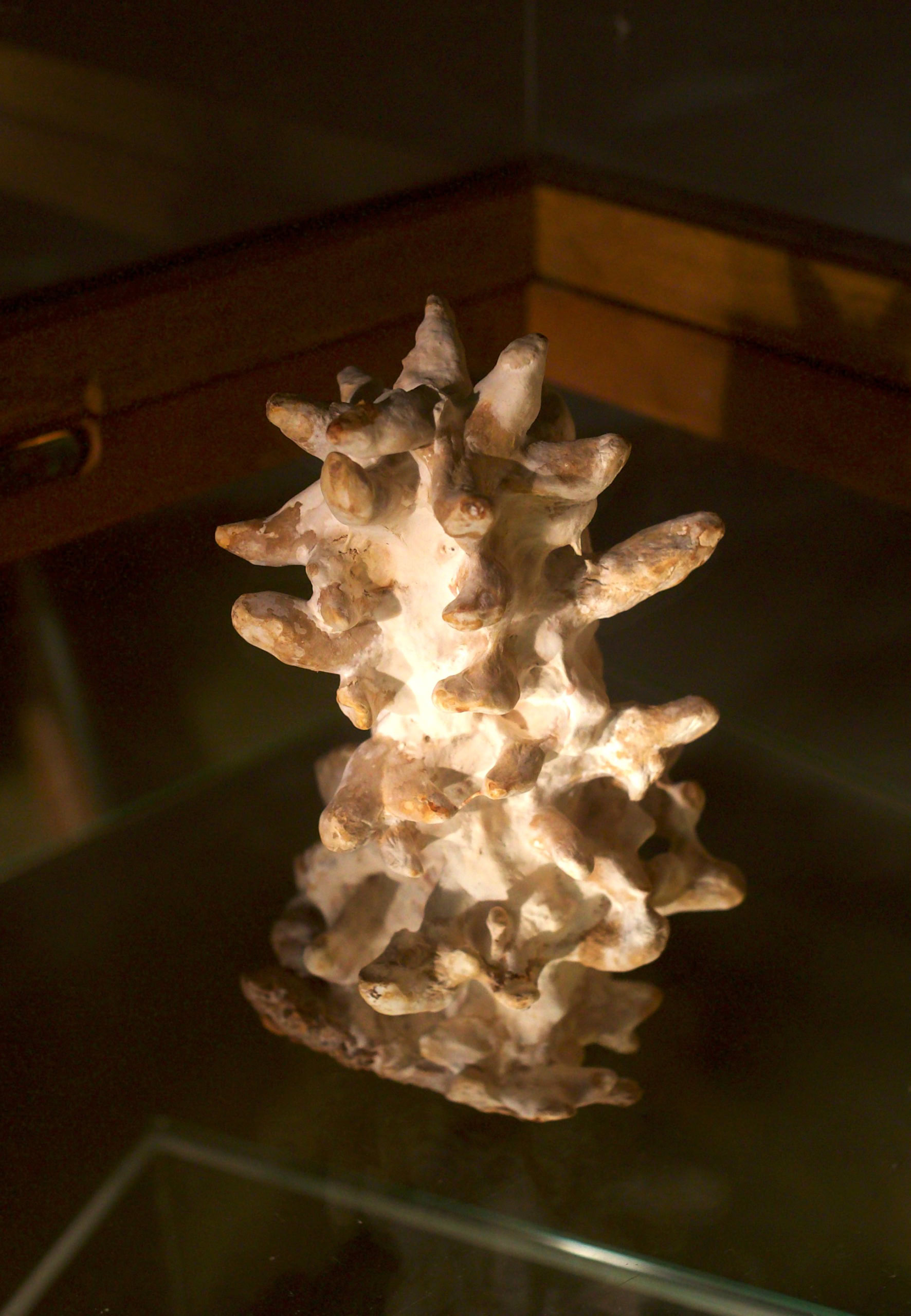 З міцелію та кераміки я роблю такі собі фейкові скам’янілості. Чому скам’янілості? Тому що останнім часом я працюю здебільшого з темою зникнення щастя. І взагалі — з феноменом щастя, який я розглядаю як патологію.