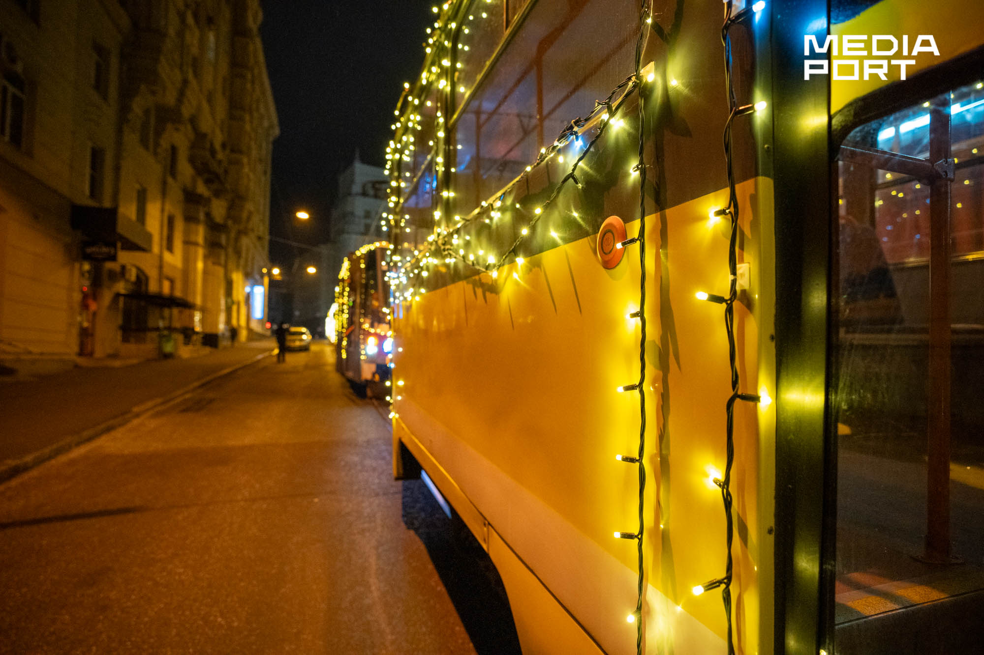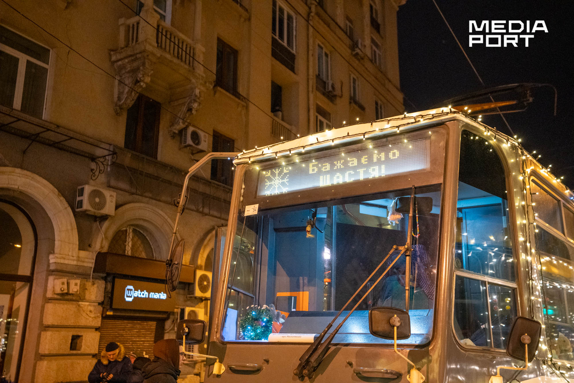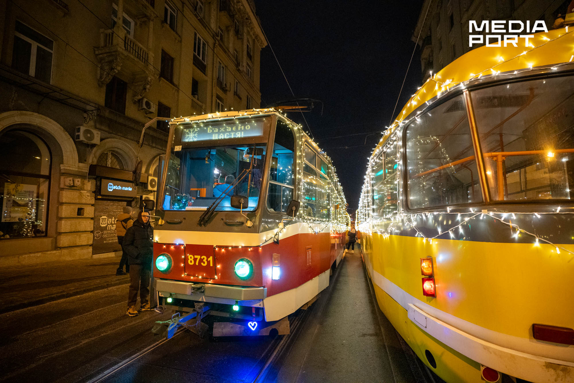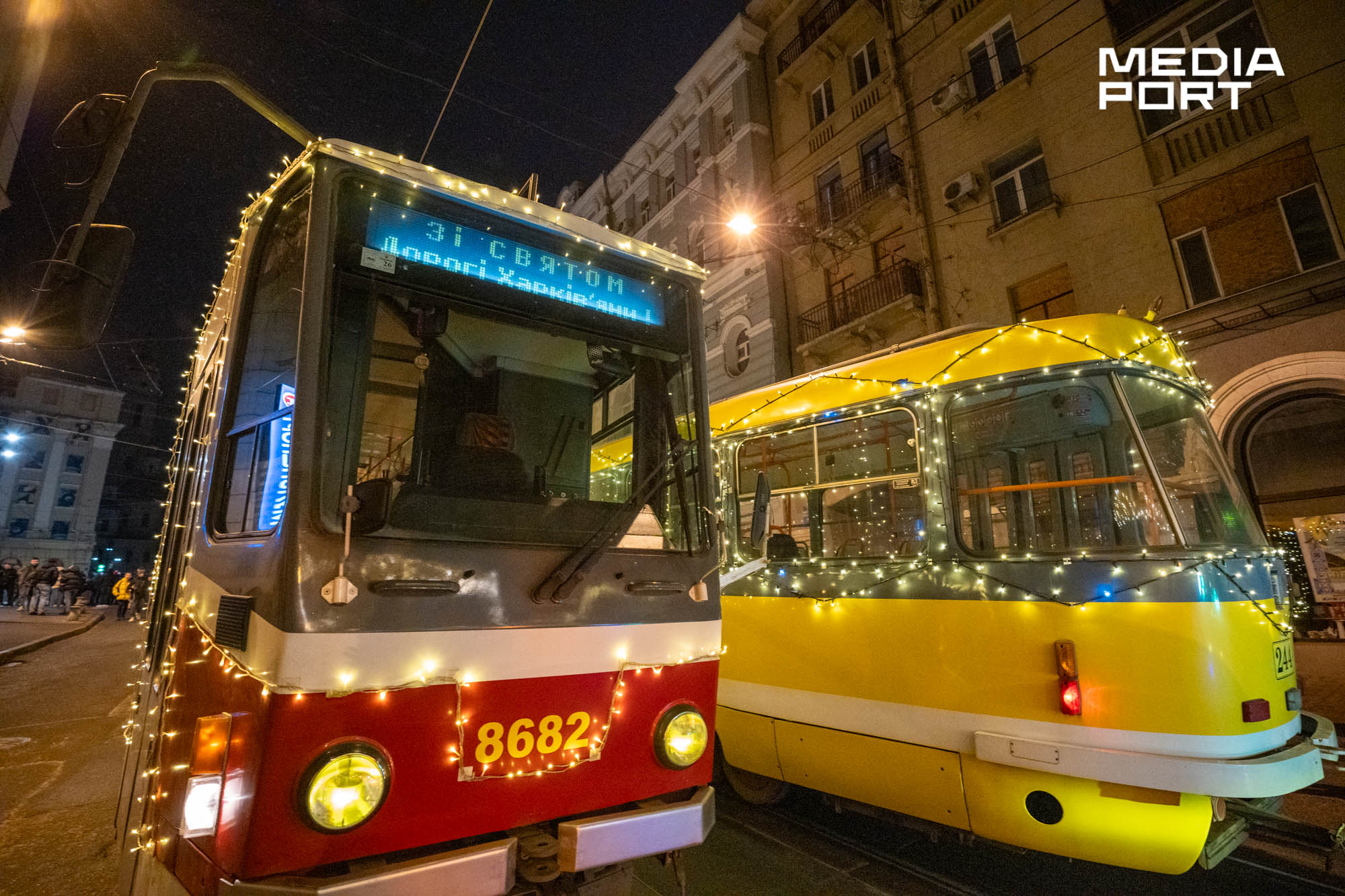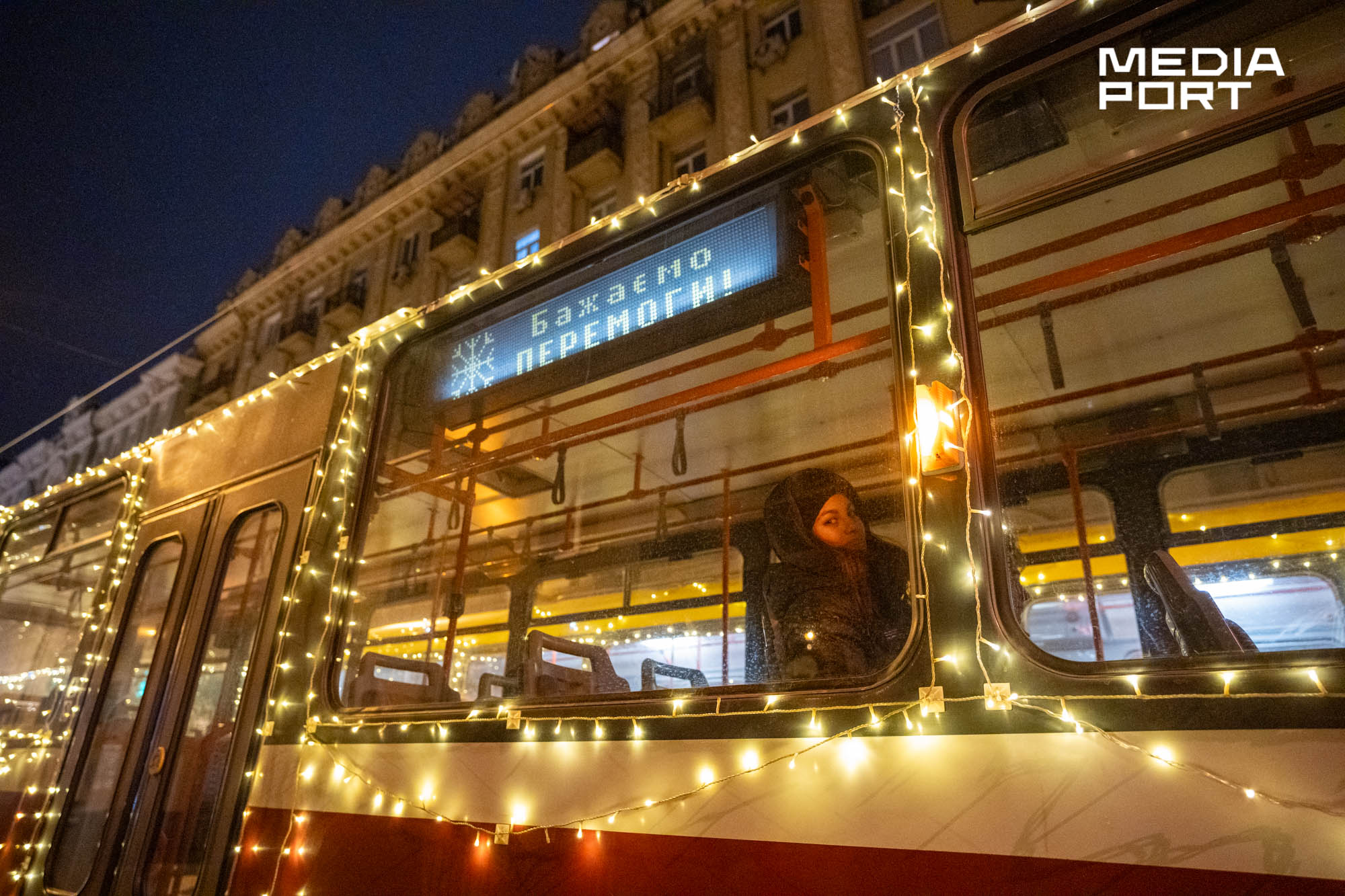 До зимових свят у Харкові оздобили ілюмінацією 18 трамваїв. Прикрашені вагони вийшли на маршрути ввечері 25 грудня, на Різдво.