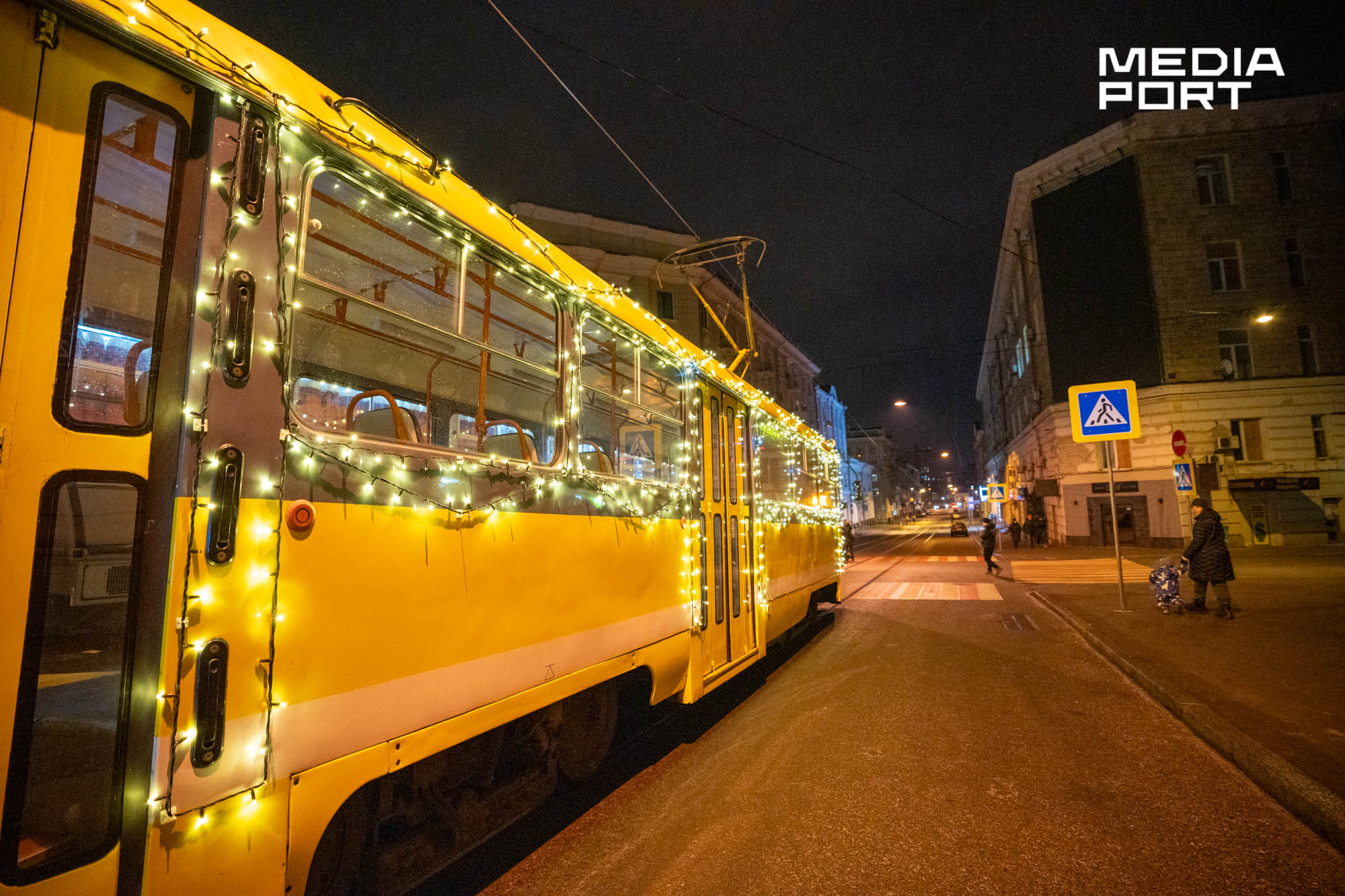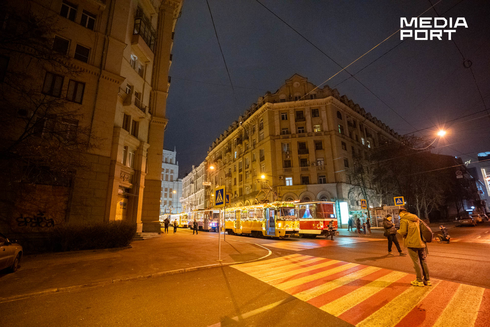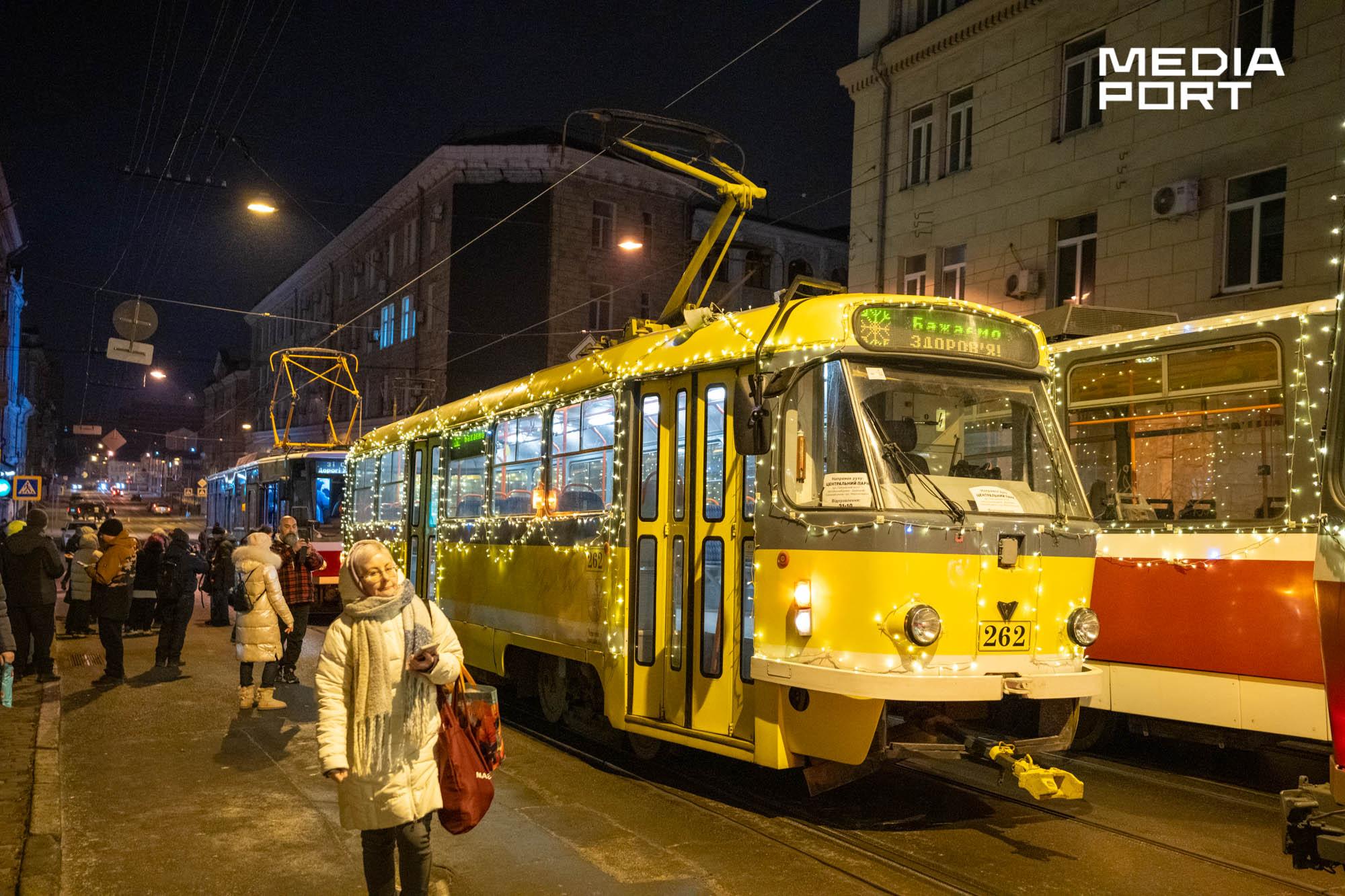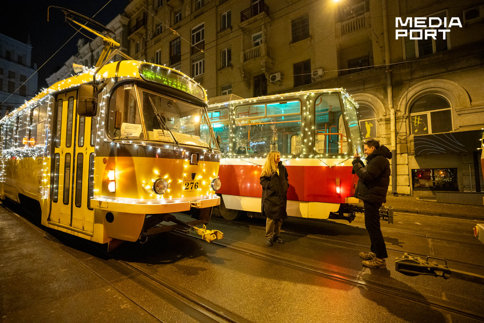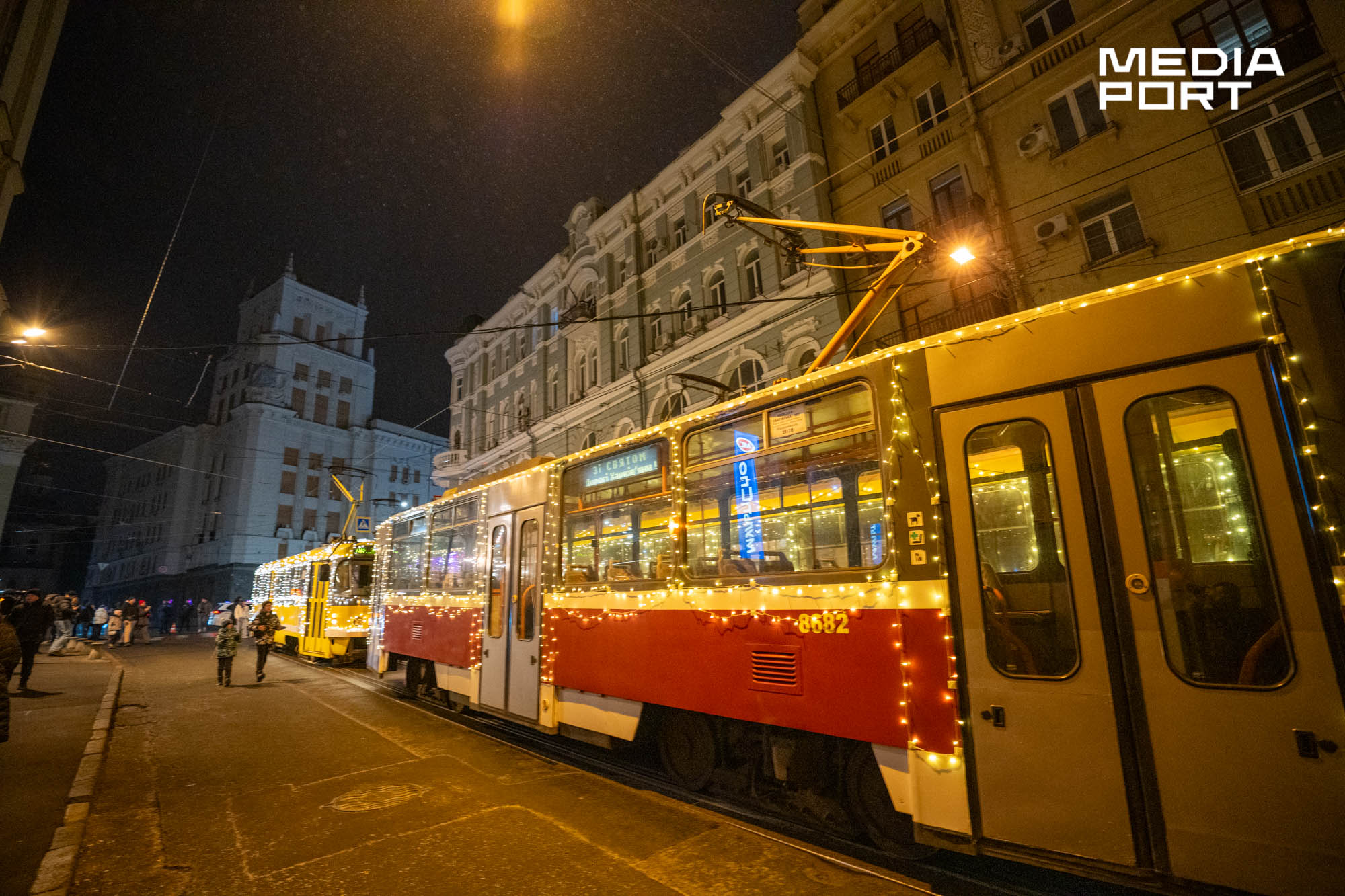 До зимових свят у Харкові оздобили ілюмінацією 18 трамваїв. Прикрашені вагони вийшли на маршрути ввечері 25 грудня, на Різдво.