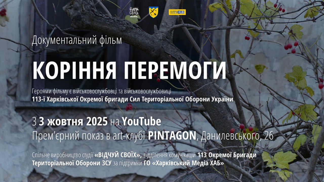 У Харкові 3 жовтня відбудеться прем’єрний показ документальної стрічки «Коріння Перемоги» — фільму про військовослужбовців і військовослужбовиць 113-ї окремої бригади Сил територіальної оборони України. Про це повідомляє Kharkiv Media Hub.