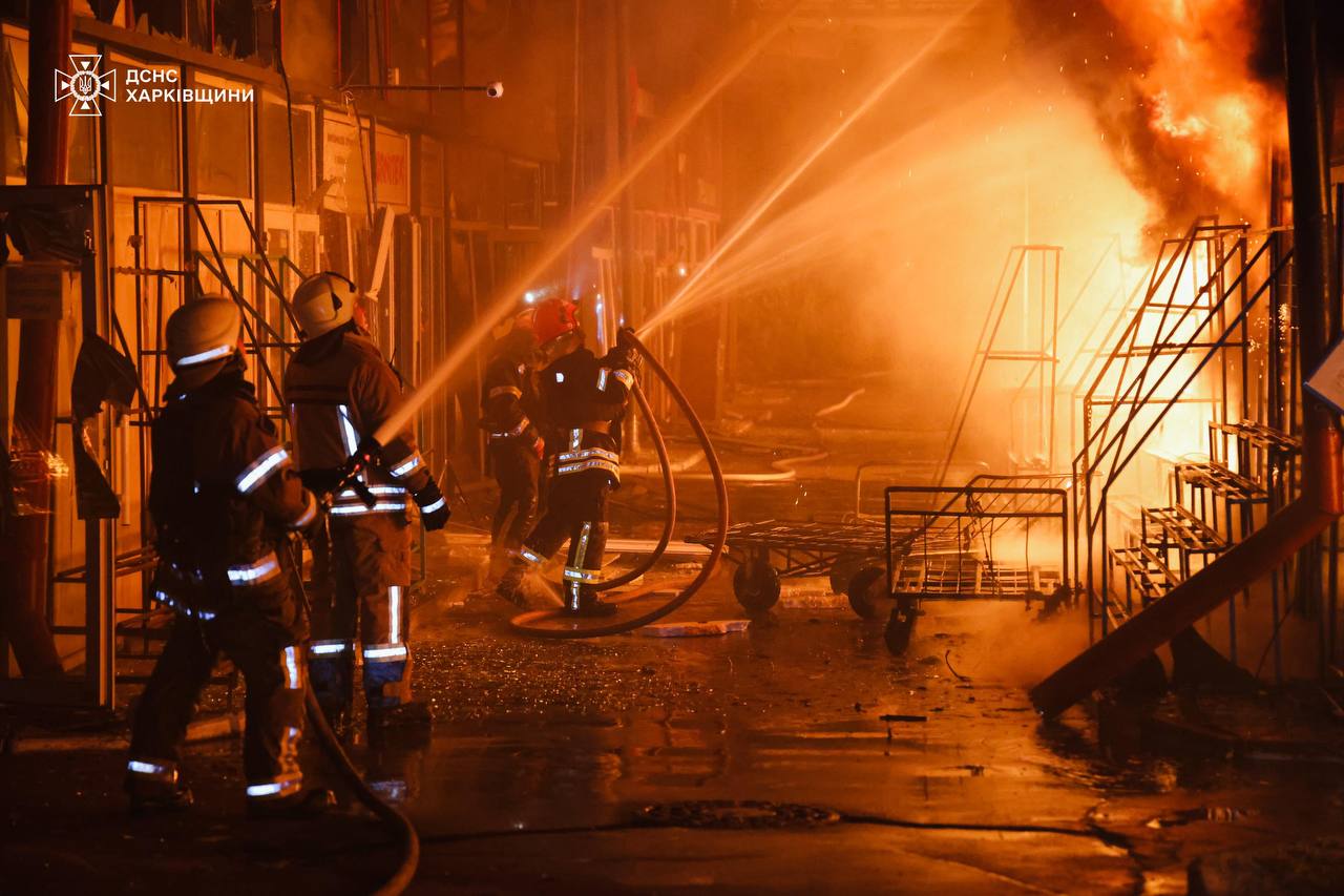 Пожежа на ринку охопила 2800 кв. м, зазначають у ДСНС Харківщини. У гаражному кооперативі — 350 кв. м.