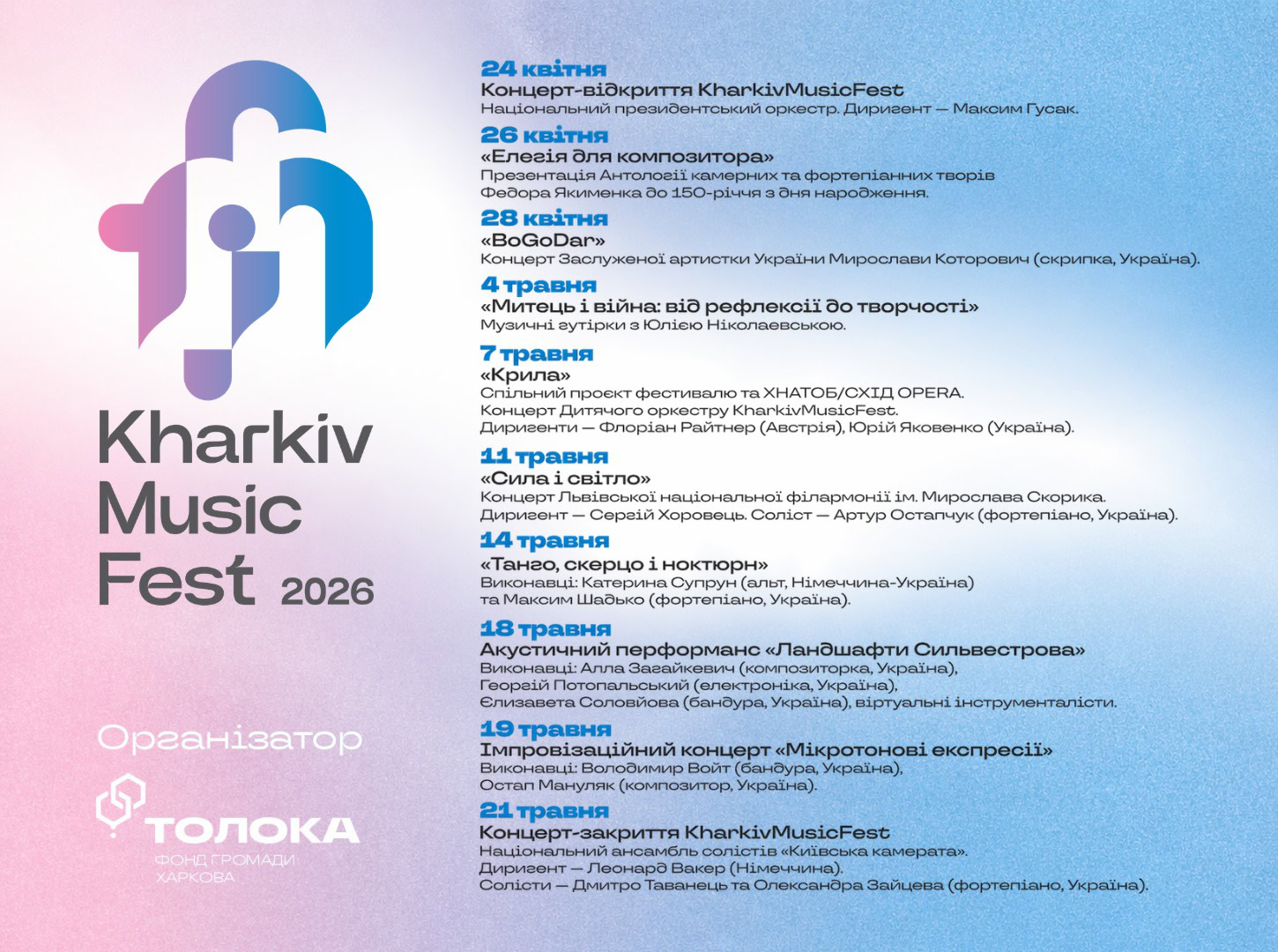 «Харків завжди був колискою футуризму, містом, яке мислить наперед і не боїться формувати нову реальність. Таким я відчуваю його і зараз. Саме тому наш KharkivMusicFest не перервався у 2022, і продовжився в наступні роки. Ми прислухались до нових сенсів, відчували і відшукували «коди відродження». Ми не зупинялись. Тема фестивалю 2026 року — «Історія про майбутнє» — це про відповідальність за сенси, які ми створюємо сьогодні. І саме музика стає мовою, через яку ми пишему нову Історію. Цьогорічна програма по суті є моделлю майбутнього, яку ми тестуємо в реальному часі», — пояснює програмна директорка Юлія Ніколаєвська.