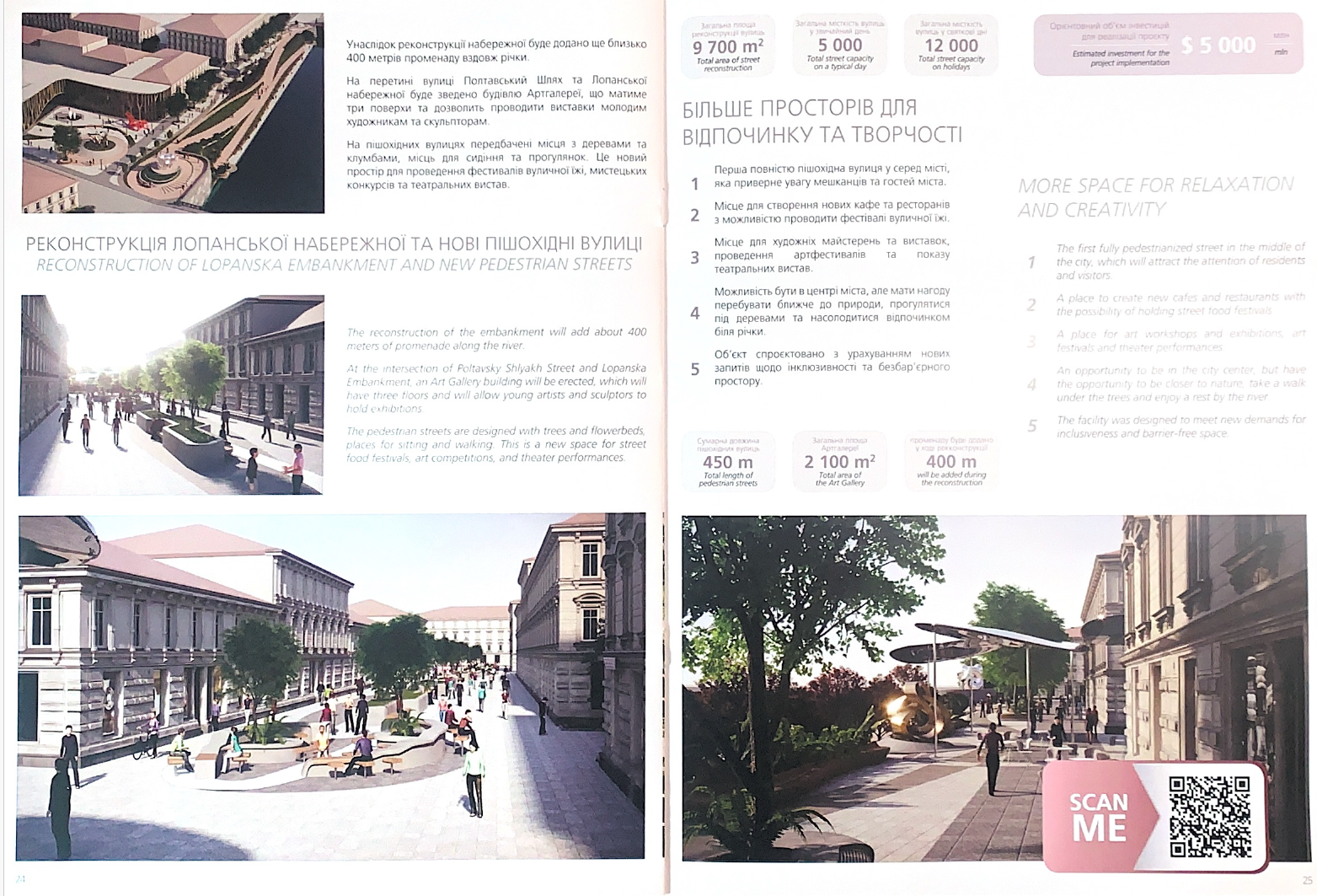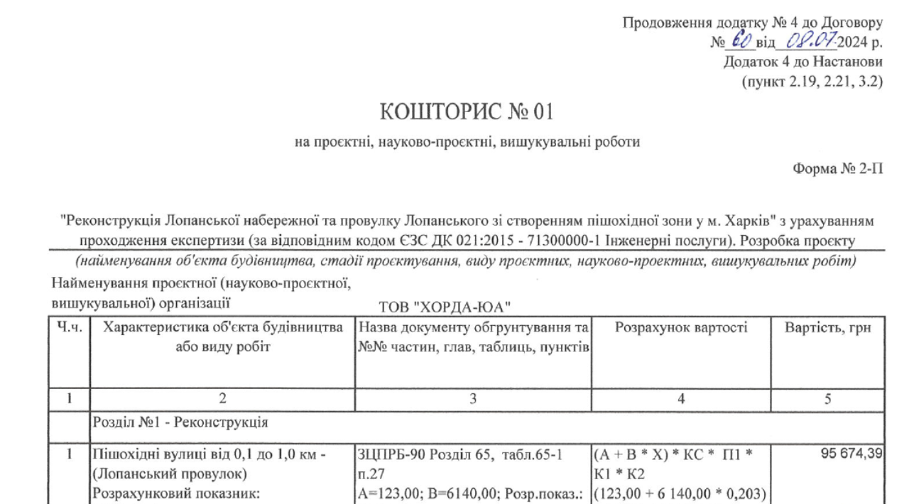 Розробку проєктної документації «Реконструкція Лопанської набережної та провулку Лопанського зі створенням пішохідної зони у м. Харків» за мільйон гривень рік тому замовляв Департамент будівництва та шляхового господарства. У кошторисі були велопарковки, садові столи, дивани та навіть вольєри для тварин та птахів.