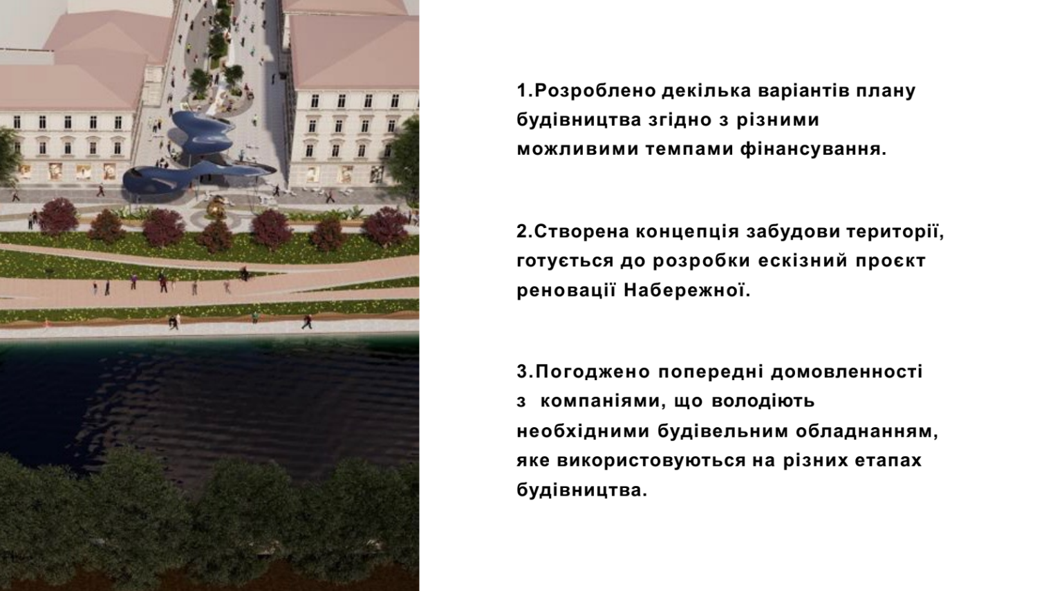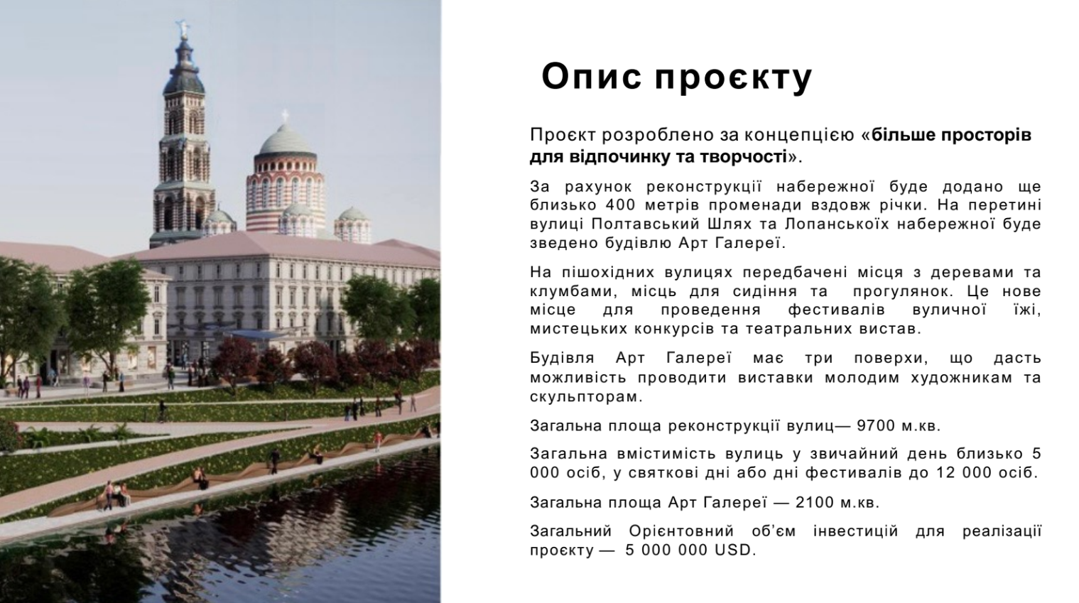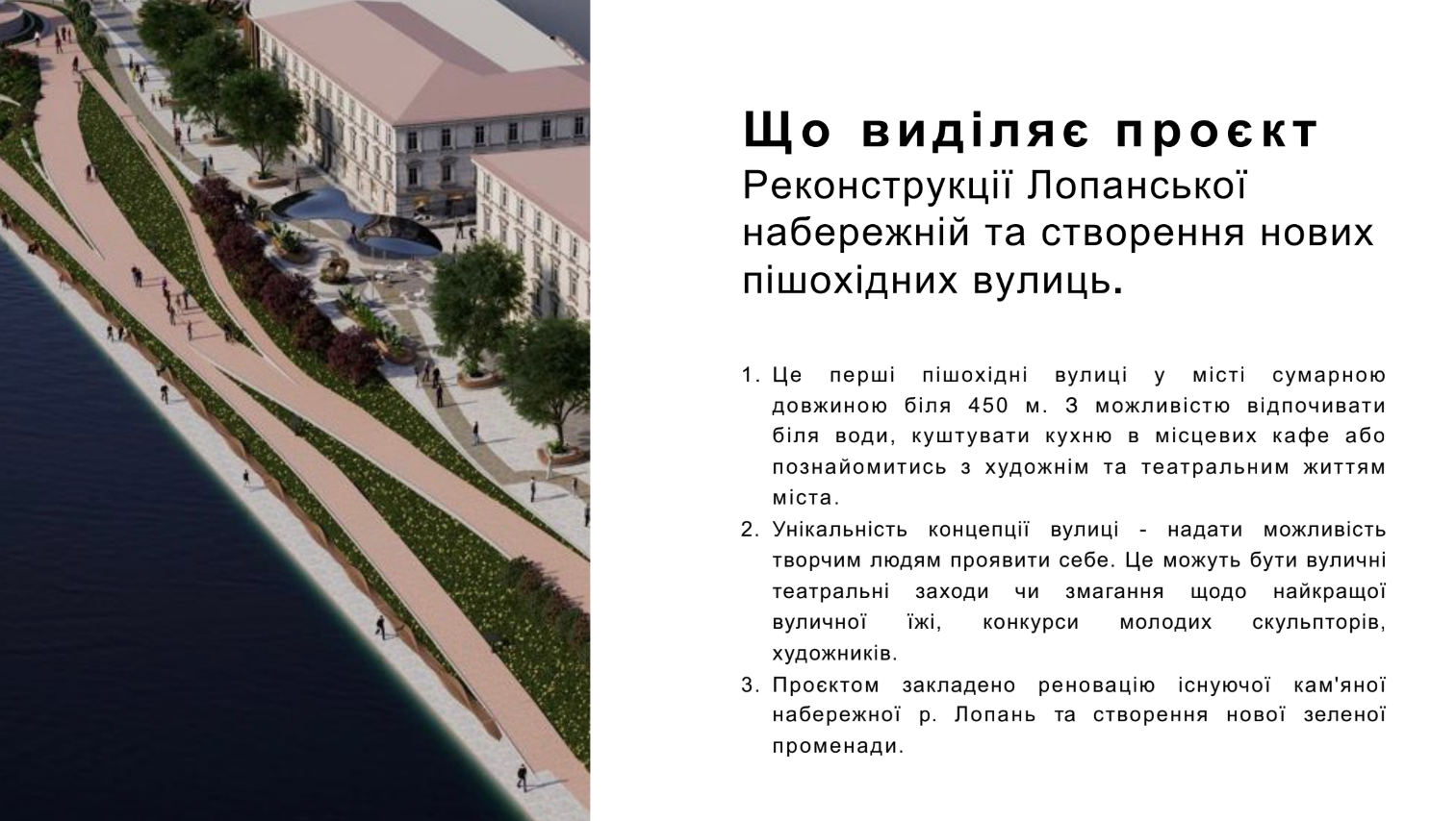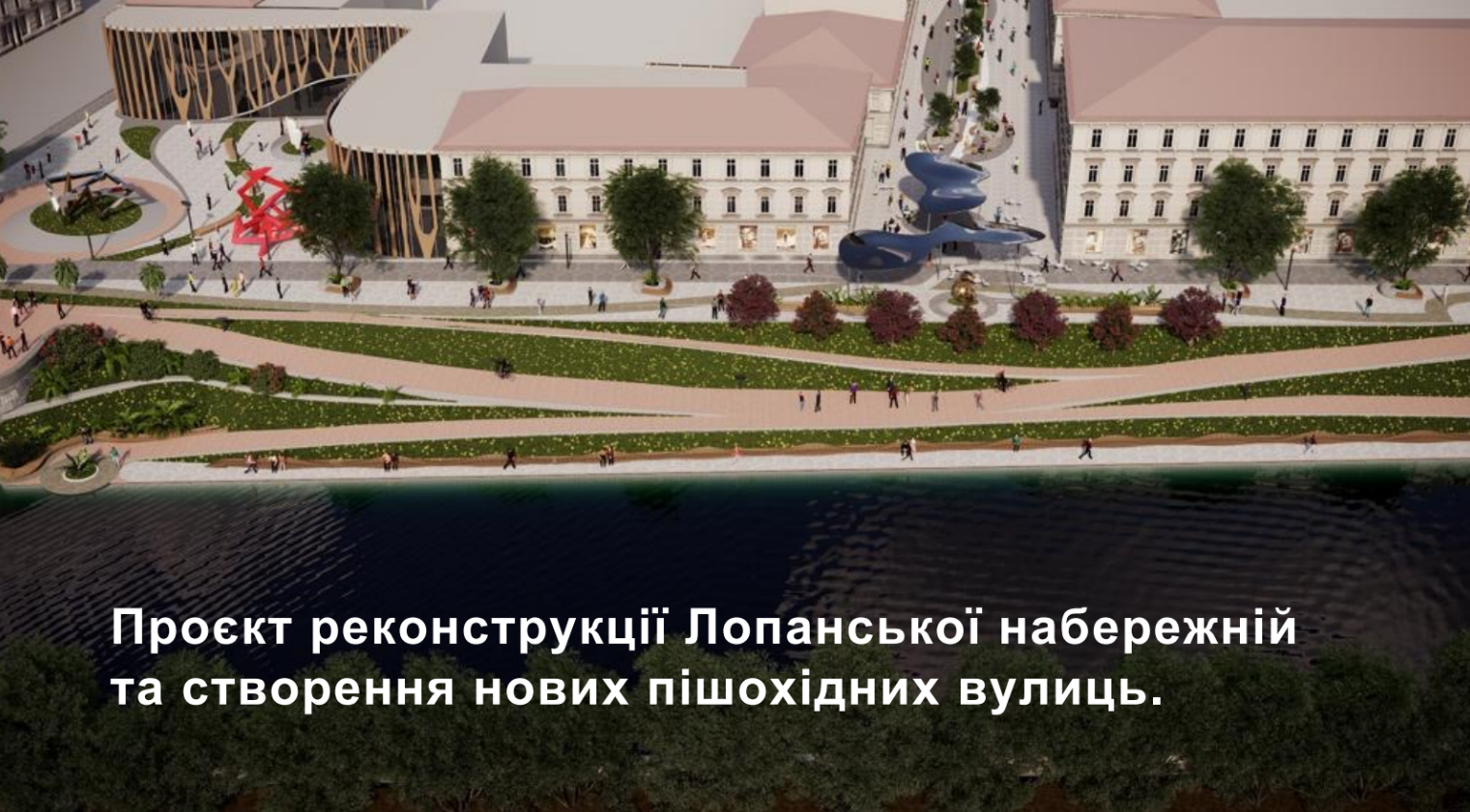 Реконструкція Лопанської набережної — один з проєктів, який міський голова Ігор Терехов презентував на форумі Kharkiv: Restart у Києві у 2023 році.