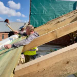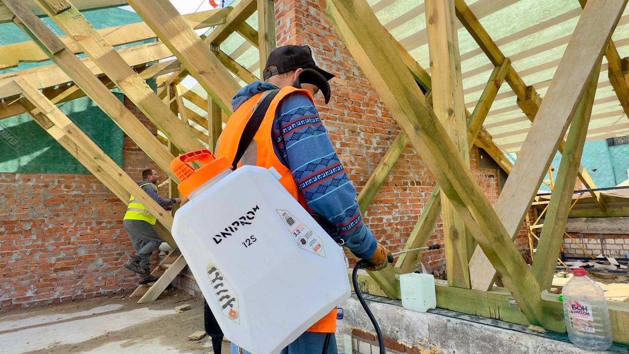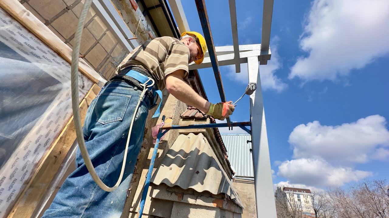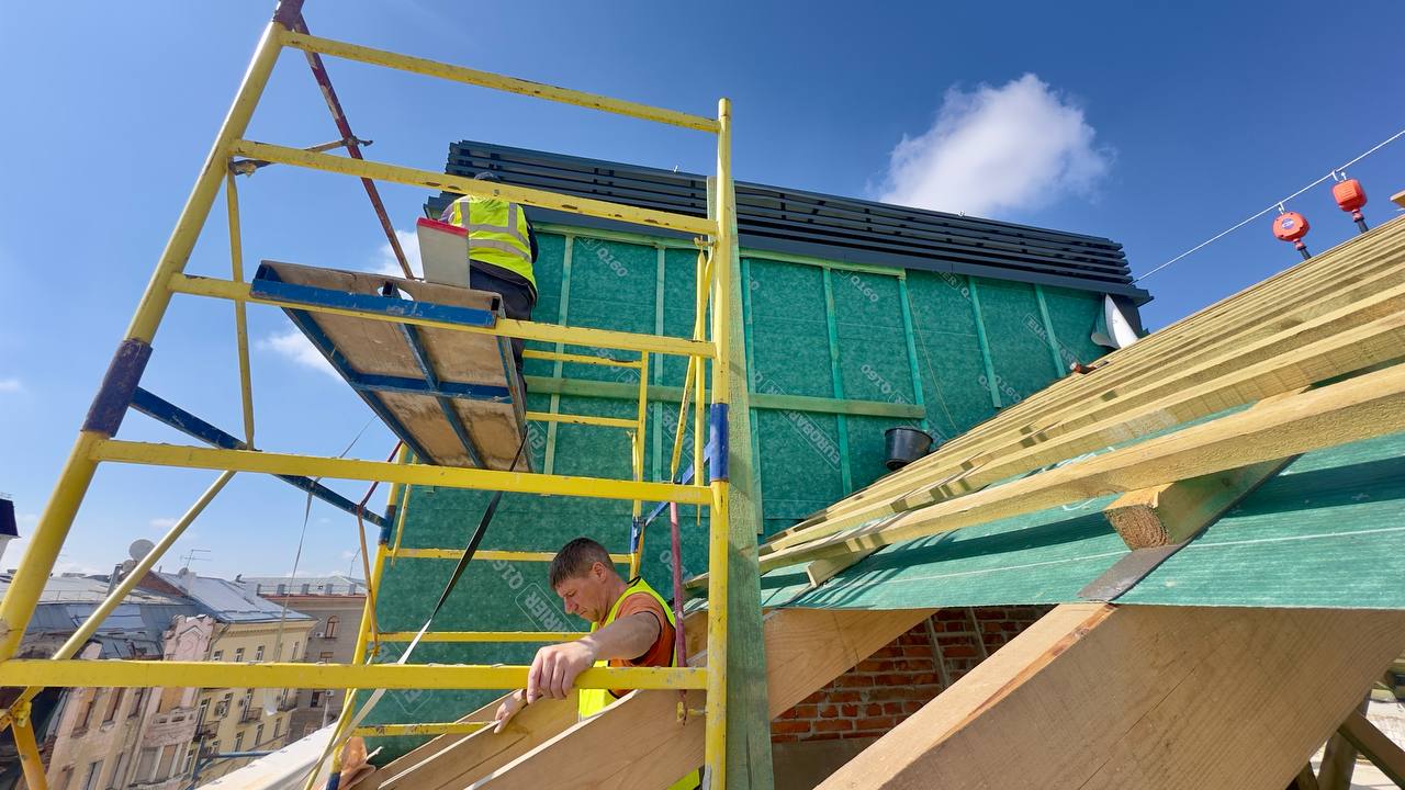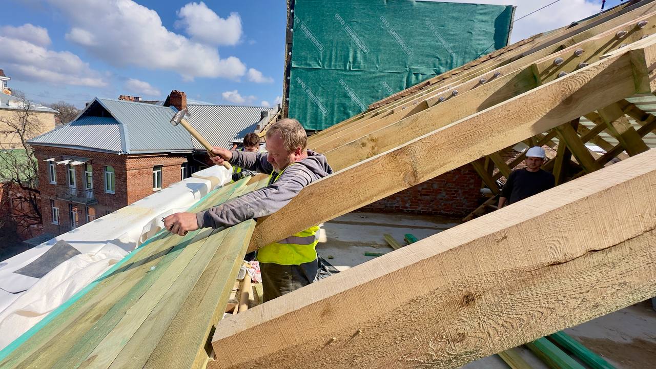 Триває відновлення покрівлі, змонтовано нову кроквяну систему. Також утеплюють вентиляційні канали, монтують обрешітку та ливнівки, прокладають електромережі. Паралельно улаштовують фасад.