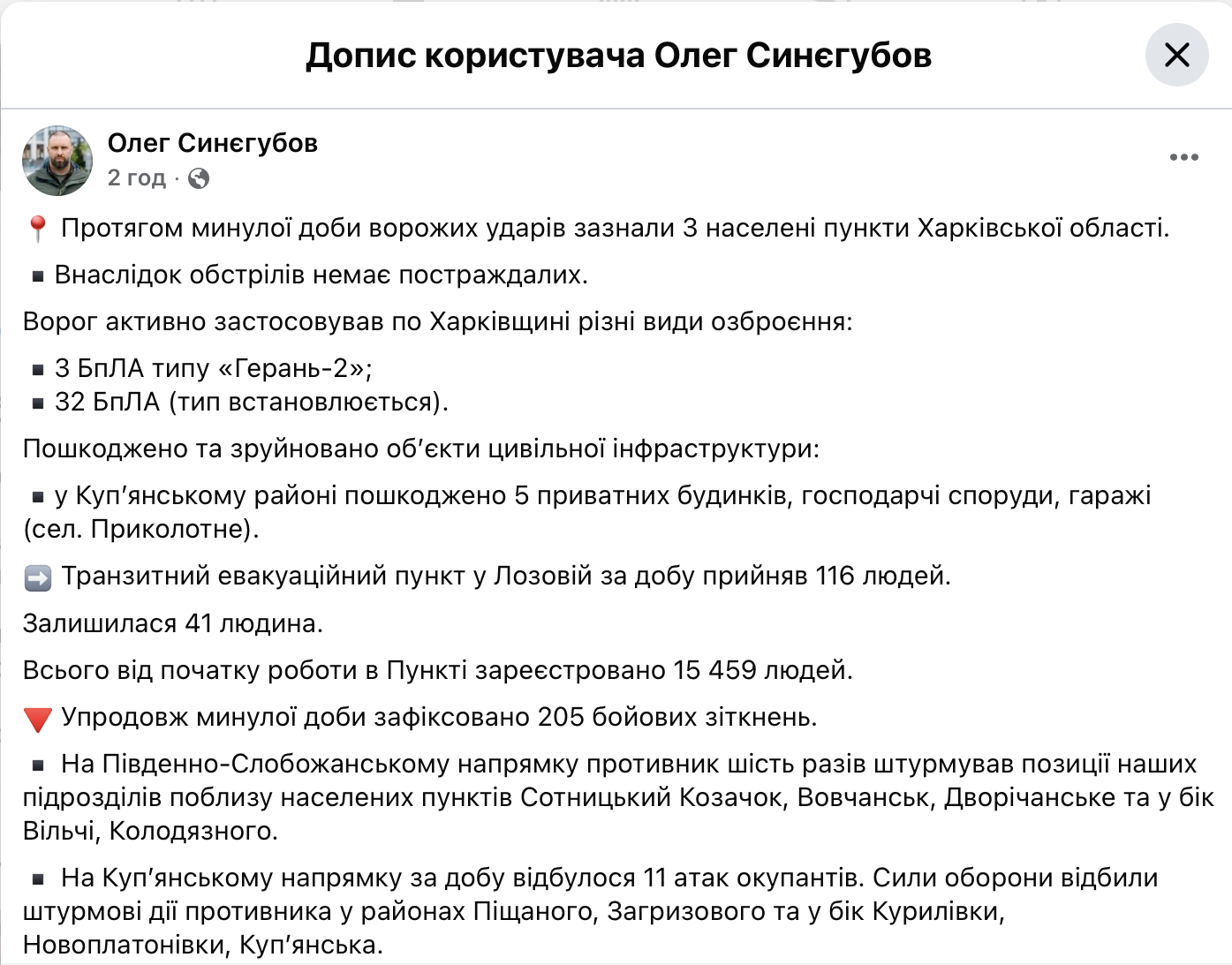 На Куп’янському напрямку було 11 російських атак. Сили оборони відбили штурми в районах Піщаного, Загризового та у бік Курилівки, Новоплатонівки, Куп’янська.