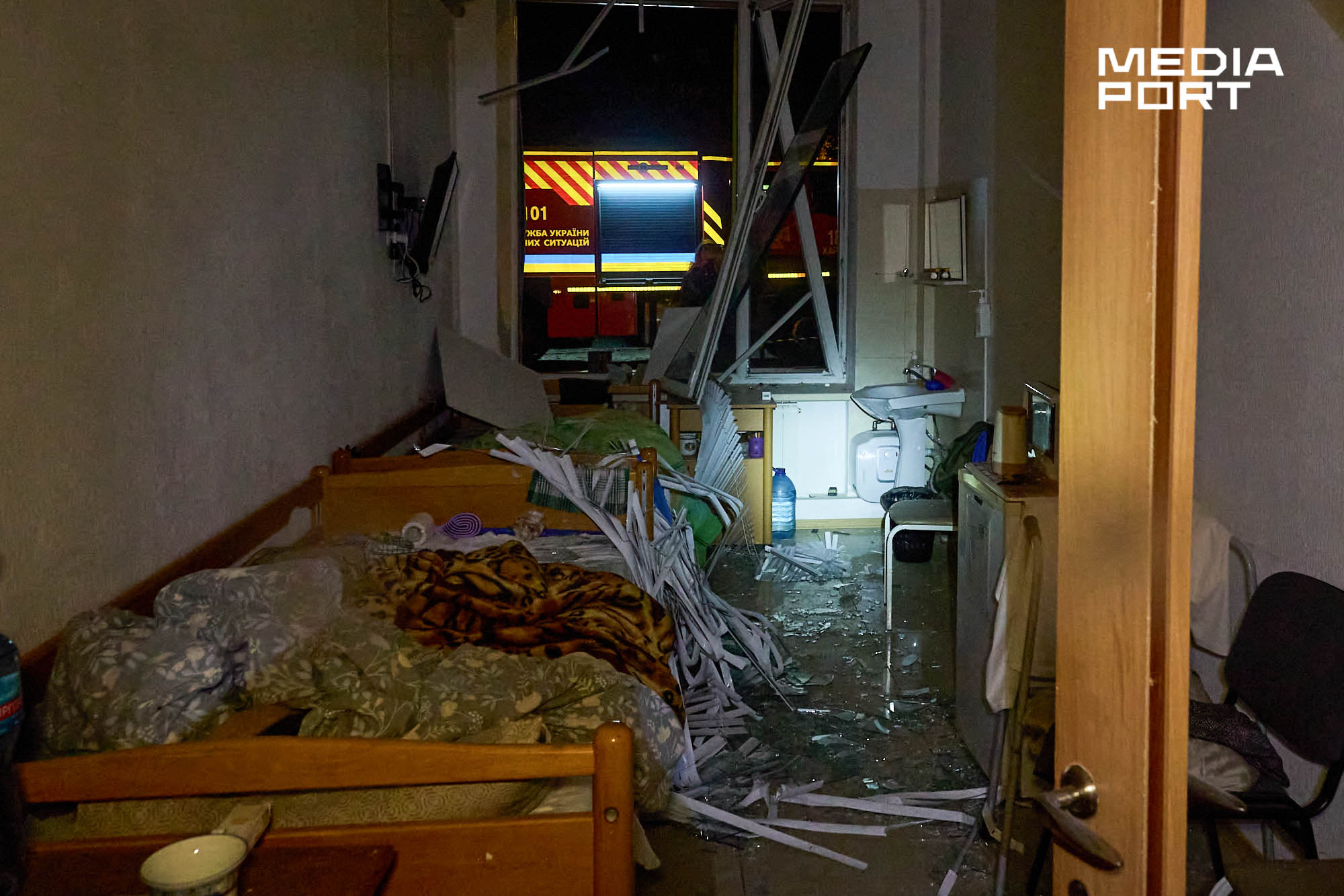 «Внаслідок удару знищено гаражні бокси, пошкоджено 19 автомобілів, вибуховою хвилею вибито вікна та двері в одному з корпусів лікарні. Постраждали 57 пацієнтів — 51 отримав гостру реакцію на стрес, ще шестеро поранені уламками скла», — описують наслідки правоохоронці.