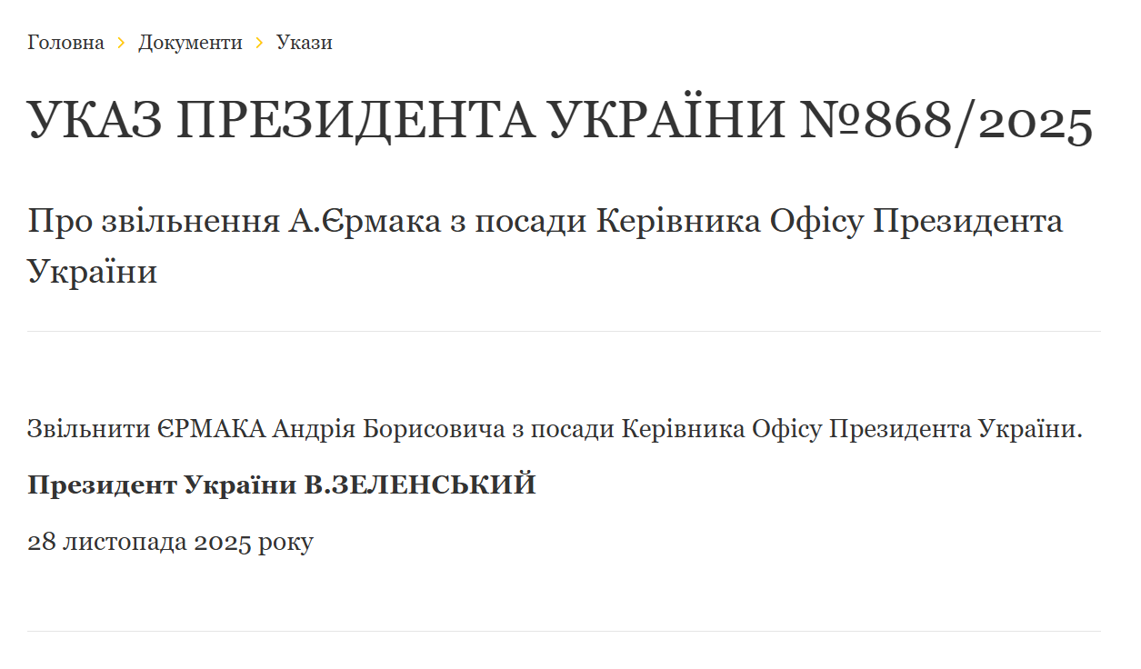 Доповнено. Указ про звільнення Єрмака опубліковано на сайті президента України.