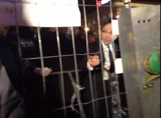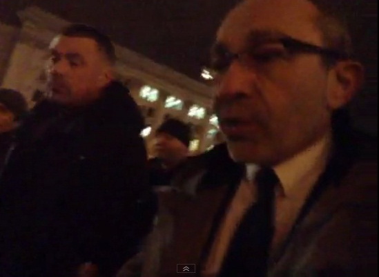Примерно в это же время на площадь Свободы приехал городской голова Геннадий Кернес. Как и в предыдущие дни, сначала он зашёл на митинг защитников памятника Ленину, а потом направился к обладминистрации и попытался поговорить с активистами Евромайдана.