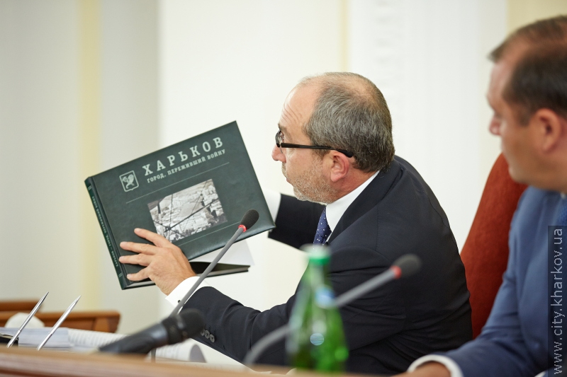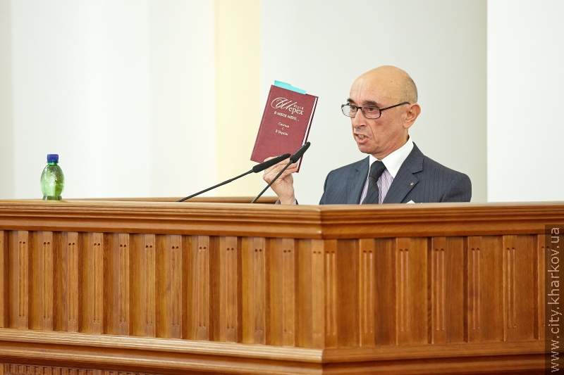 «Вы нас извините, мы будем вспоминать то, что было вами скрыто. А было вами скрыто то, что Юрий Шевелёв был, я подчёркиваю, пособником режима оккупации, который убил в Харькове почти 700 тысяч человек. 700 тысяч человек!» — сказал мэр и достал книгу.