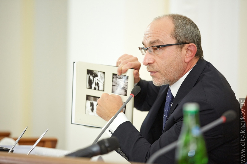 «На этих фотографиях, в этом альбоме, который мы раздаём ветеранам… Называются чёрные страницы Харькова. Переворачивая чёрную страницу, такая фотография: здесь, на этом доме, где жил Шевелёв, повешены харьковчане. Вот они висят на улице Сумской. Напротив здания комендатуры, для устрашения других жителей города Харькова. Вы эту фотографию видели? Вы знаете, что Шевелёв занял квартиру и он не отрицает этого? Я вам зачитаю его слова из мемуаров, что он занял квартиру еврейской семьи», — заводится Кернес.