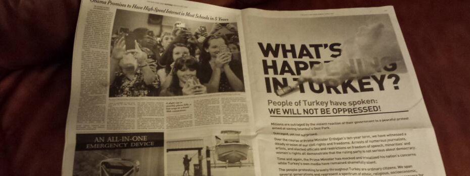 Очередной номер The New York Times вышел в свет с рекламной полосой, полностью выкупленной турецкой диаспорой в США. Текст, помещённый на полосу, рассказывает, по версии авторов, правду о том, что происходит в Турции.