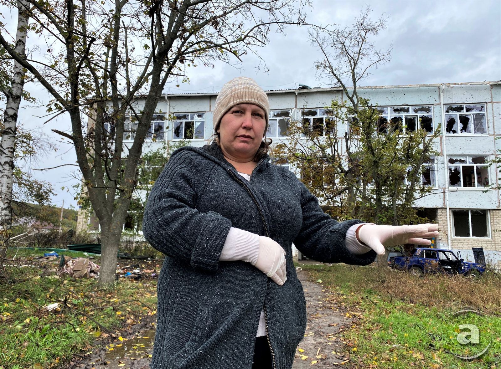 Трохи далі за перехрестям — ще одне рідне місце для Людмили, місцева школа, де навчалися понад 400 дітей. Будівля початкових класів вигоріла вщент. Нова, відремонтована школа, з сучасними меблями та інтерактивними дошками значно пошкоджена.