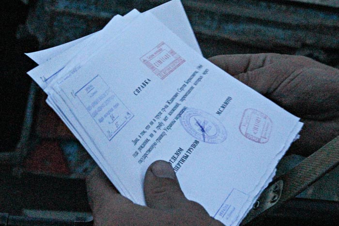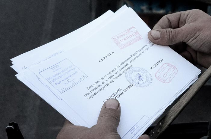Таких справок тридцать одна — по числу гробов, отправленных в этой фуре-холодильнике из Донецка два часа назад. Колонна из трёх машин (машина с сотрудниками милиции, сама фура и ещё одна машина — в ней ехали мы, журналисты) выехала из города только под вечер, и, пока мы добрались до границы, уже стемнело. В свете фонарей мелькают лица пограничников, разговаривать никому не хочется, все просто ждут, пока закончится проверка, и не отрывают глаз от грузовика.