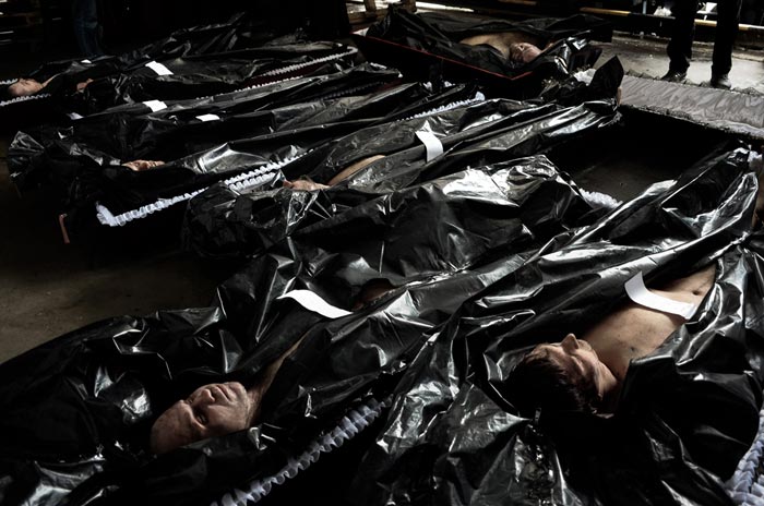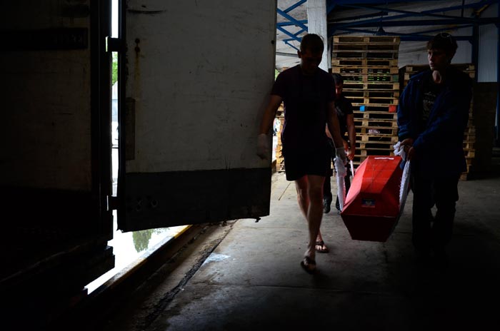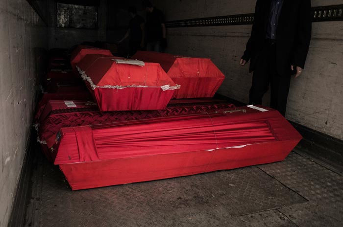 Там и предстояло положить их в гробы и приготовить для отправки в Россию. Грузовик с гробами заехал на территорию, ворота закрыли. В небольшом закутке, огороженном деревянными поддонами от глаз случайных запаздывающих с работы сотрудников фабрики, активисты наспех выносили тела из холодильной камеры, собирали части тел, клали останки сначала в чёрные пакеты, потом в разноцветные гробы, курили, смотрели по сторонам, загружали гробы в фуру. В это время другие активисты рисовали краской на бортах и крыше грузовика красные кресты и цифры «200».