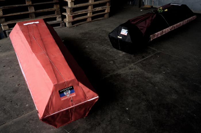 Разноцветные гробы, которые, как сообщили активисты ДНР, собирали по всему Донецку, выставили у входа в морг, и журналисты гадали, внутри уже тела или нет.