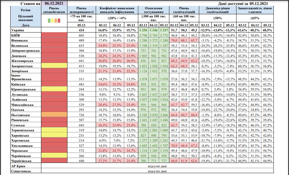 На 6 грудня всі показники, за якими визначають епіднебезпеку, на Харківщині відповідають жовтому рівню. Подібно — ще у чотирьох областях: Закарпатській, Кіровоградській, Тернопільській і Чернівецькій.