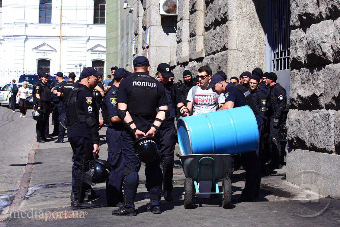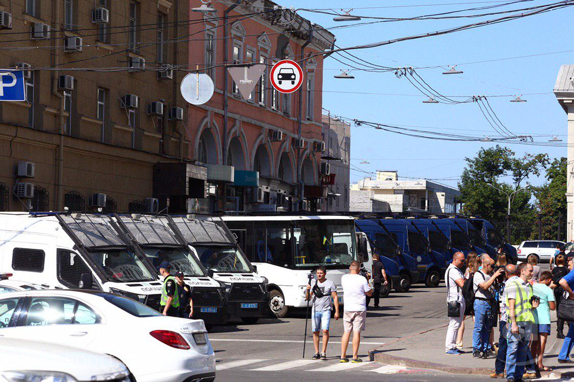 Навколо міськради та усередині — посилені заходи охорони. Біля мерії — нацгвардійці, працівники спецпідрозділу «ТОР» у повному екіпіруванні.