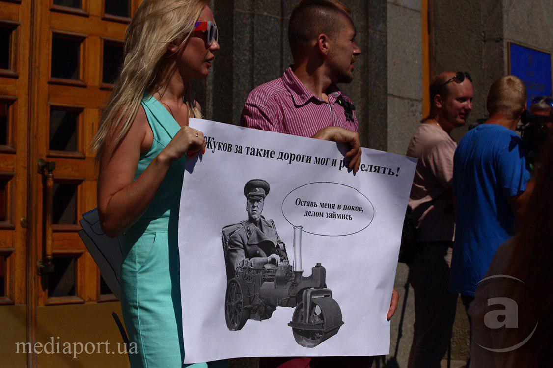 «На захист декомунізації!», «Ні комунізації Харкова», «Жуков — кривавий м’ясник!».