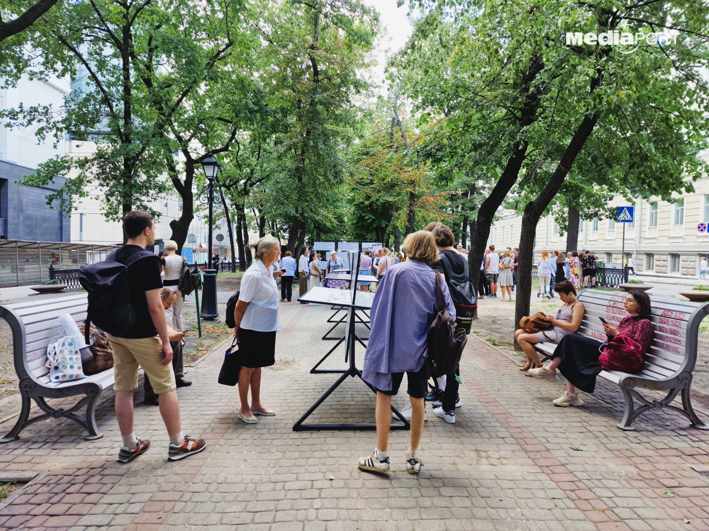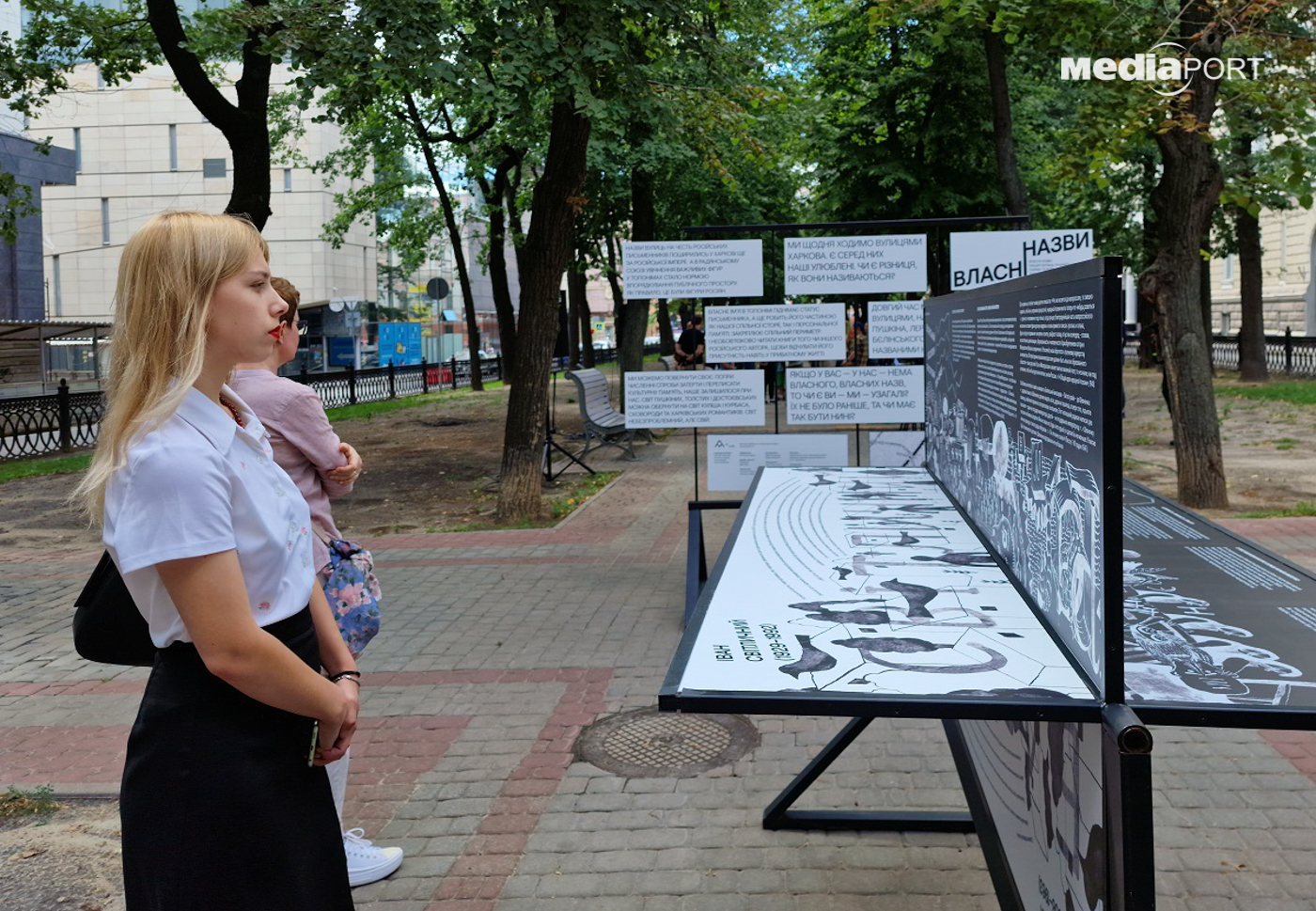 Стенди виставки, яку відкрили 29 липня у Театральному сквері, пропонують харків’янам поміркувати над назвами міських вулиць. Багато з них названі на честь російських письменників — Пушкіна, Лермонтова, Бєлінського, Горького та інших.