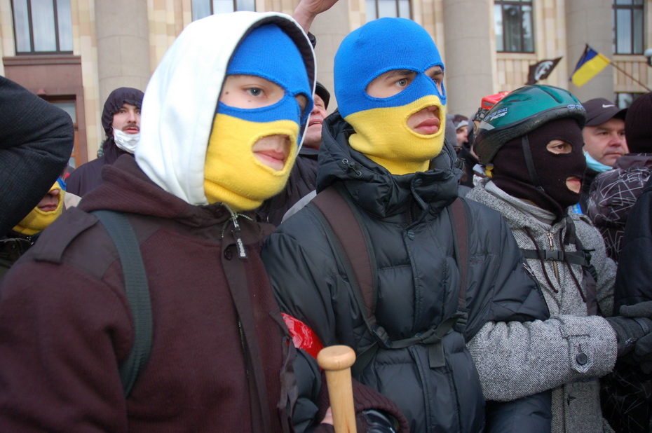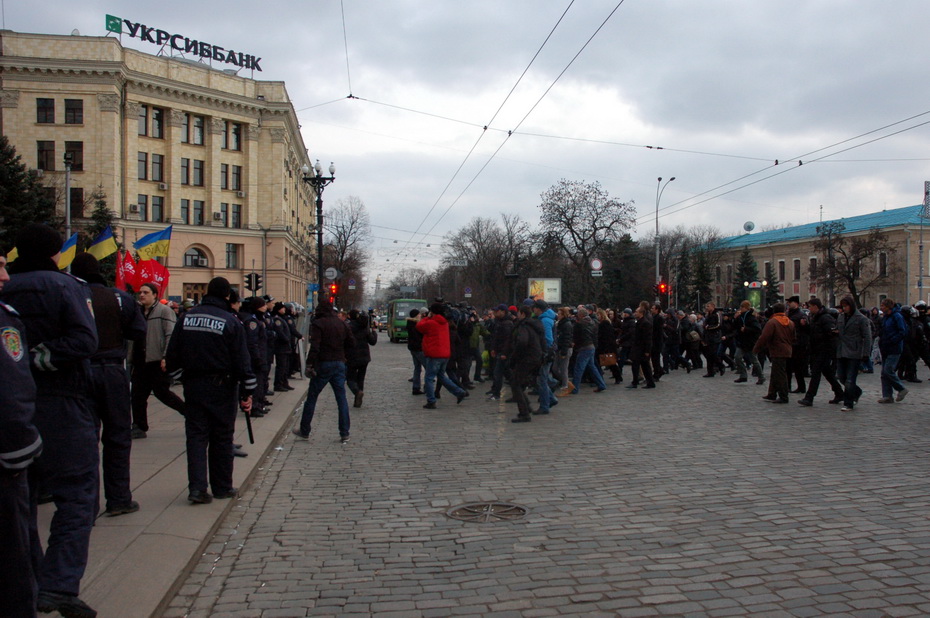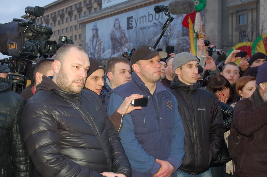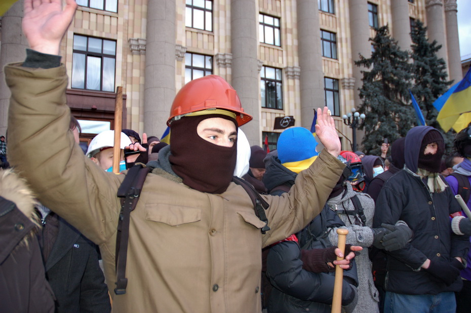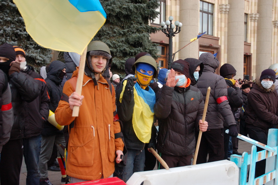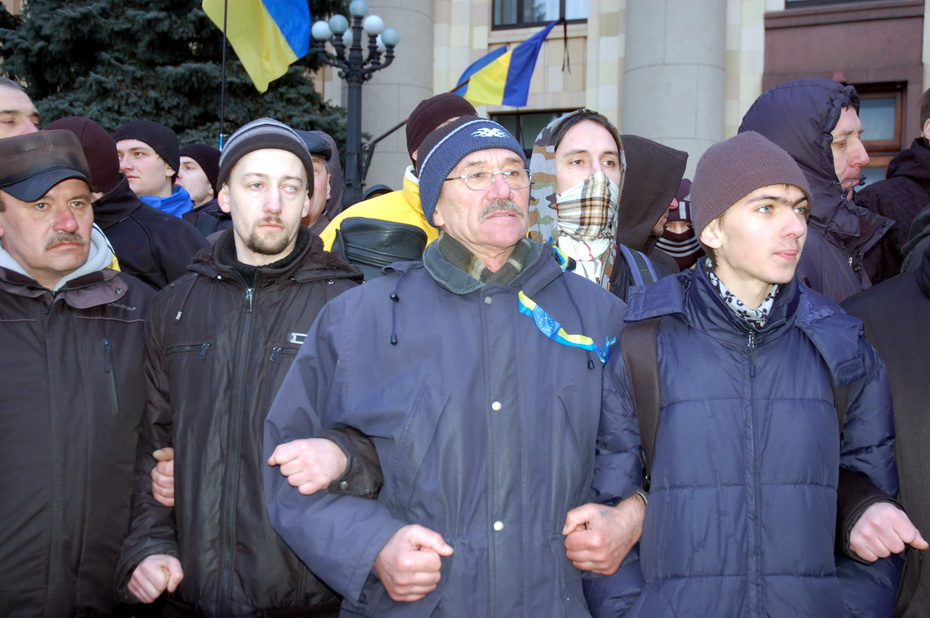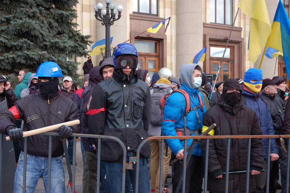 Перед зданием областной государственной администрации — оборона Евромайдана. Центральный вход ограждён забором. Молодые люди держат в руках деревянные палки. «Кернеса на нары!», «Победа за нами!», — скандируют они.